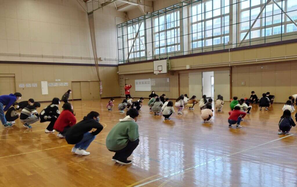 小学生が楽しめるように高校生が遊びを考えて交流を図るという主旨のボランティアです。ただ、この日は3年ぶりかつ今年度初回ということで、ミニ児の先生主導で顔合わせをしつつ、小学生の運動能力やコミュニケーション能力、状況を感じてもらいました。