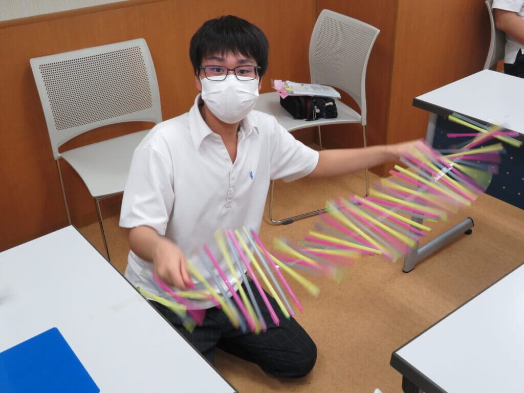 身近な材料を使って、ウェーブマシーンを製作し、波の伝わり方や合成・反射・定常波について体感しながら学びました。