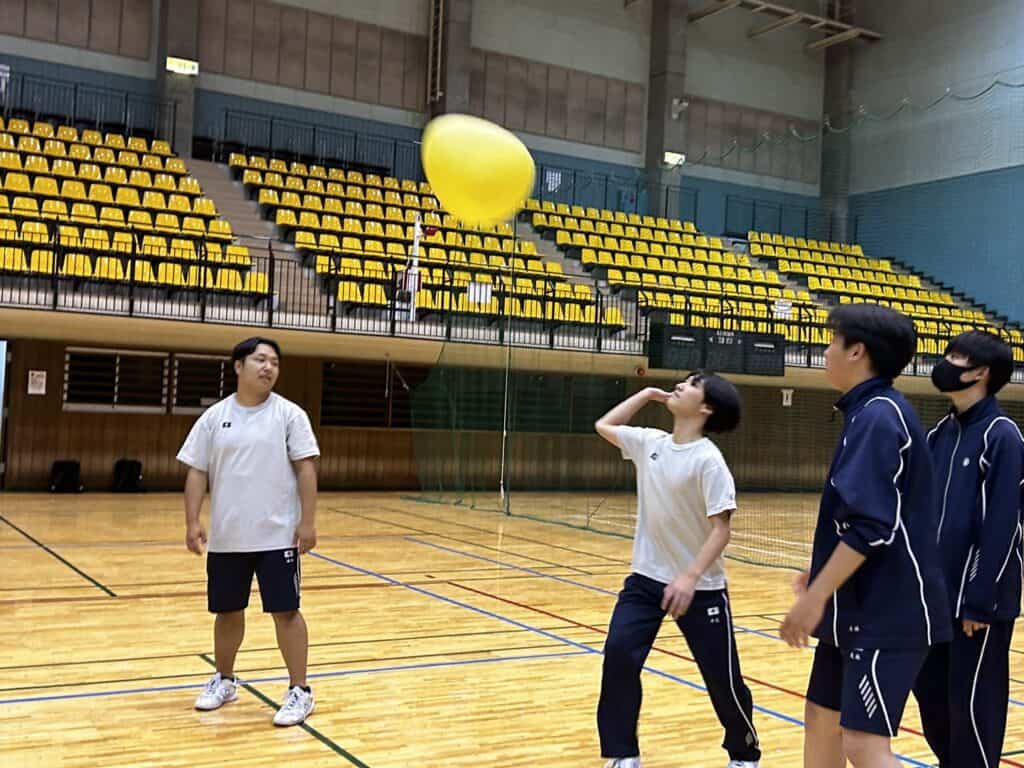 スポーツ分野の「ニュースポーツ」の授業では、「フラバールバレーボール」を行いました。「フラバールバレーボール」とは、柔らかく、不規則な形をしたボールを使ったバレーボールです。不規則な形をしているので、ボールの動きの予測がつきにくく誰でも楽しめるスポーツです。