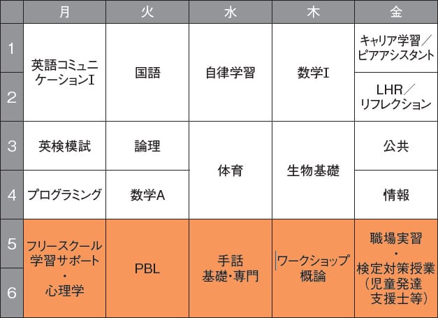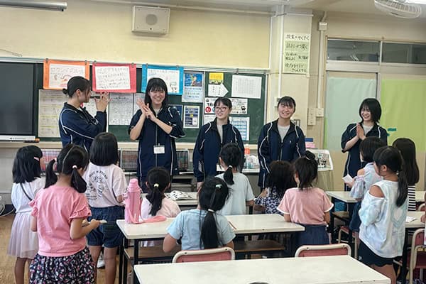保育・福祉コースでは、多くの人の「笑顔」を引き出すために、生徒同士でワークショップを設計して、フリースクール・保育園・学童・老人ホームなどで実践しています。特に「手話を社会に広める活動」として、ショッピングモールなどで手話パフォーマンスや、手話をつかったミニゲームなどを行っているイベントは好評です。生徒たちは、この授業・活動をとおして企画・運営力も身につけることができます。