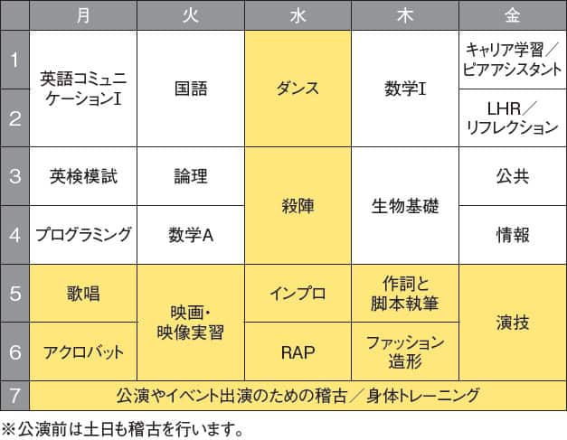 ダンス・演劇・歌唱・殺陣・RAP・インプロ(即興劇)の6つをメインにあらゆる側面から表現力を育成します。