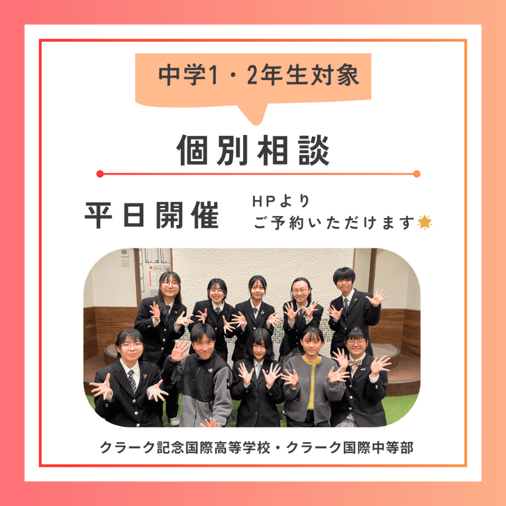 クラーク記念国際高等学校広島キャンパスまたはクラーク国際中等部広島キャンパスに興味をお持ちの中学1・2年生の方は、個別相談にお越しください♩