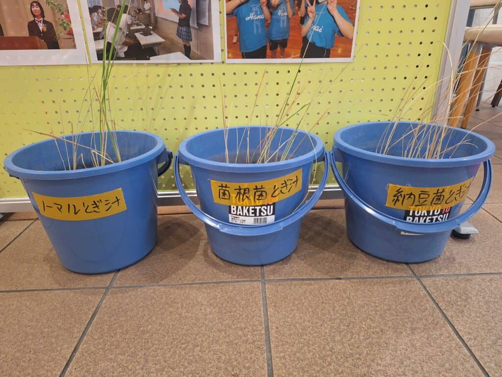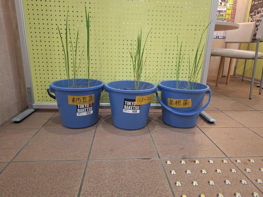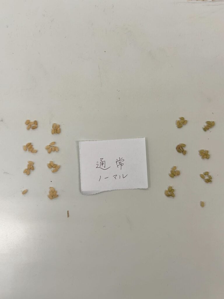 今年度は、月面に模した土を用意し、より米を育てられる環境は何か試行錯誤しながら米の栽培に取り組みました。昨年度の反省を生かし、普通の水を与えた米、米のとぎ汁を与えた米の二種類に大きく分け、さらに普通の土、菌根菌を混ぜた土、そして納豆菌を混ぜた土の全6種類の土に分けて栽培をしました。