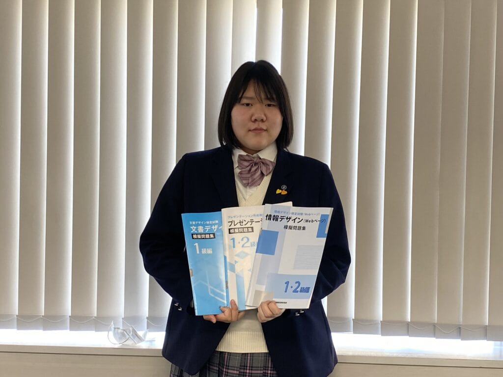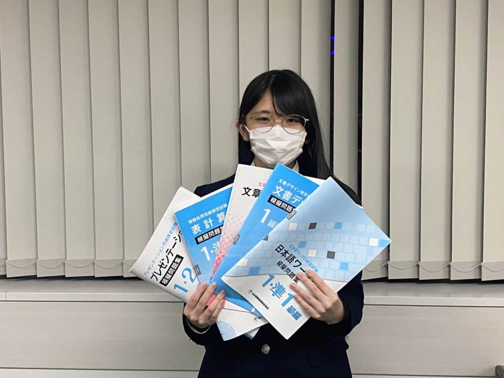 今回撮影に協力してくれたのは総合進学コース3年生の2人。1年生から受験した検定の問題集を持ってもらうと・・・・数が多く全ての問題集は待ちきれませんでした!