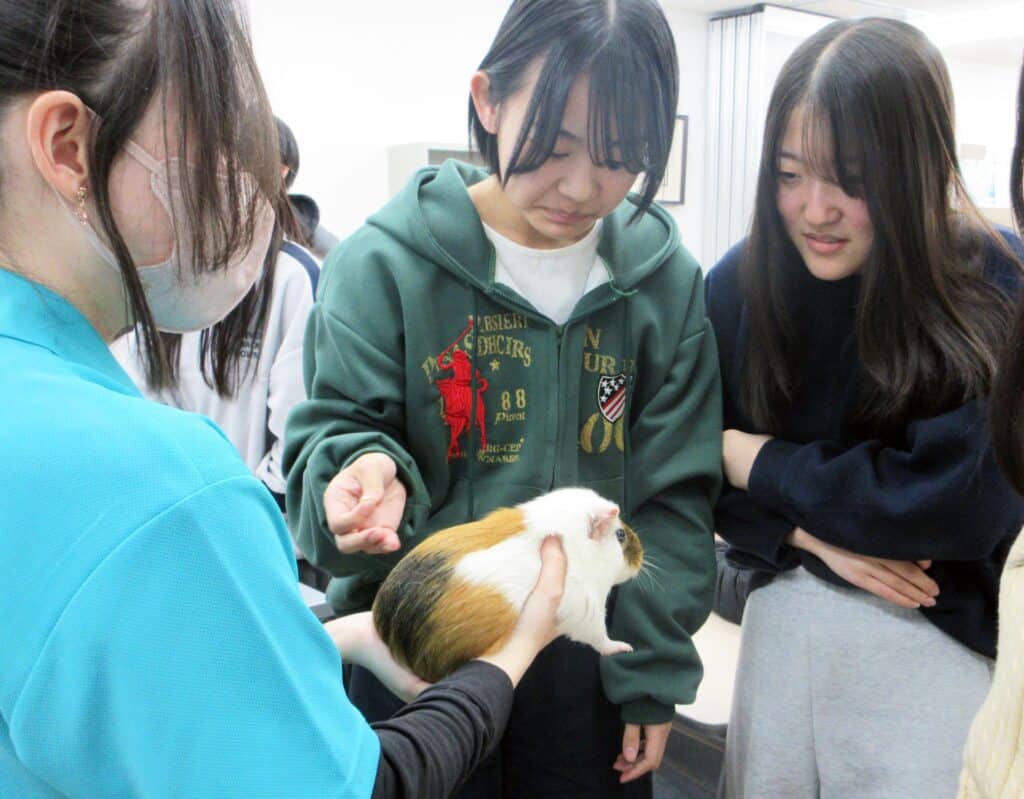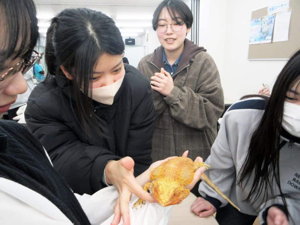 神戸動植物専門学校から2人の先生と2人の学生が来校され、動物の看護についてお話しされました。何種類かの動物たちも一緒に連れてきてくださいました。