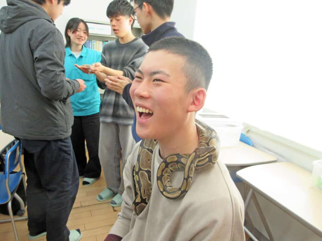 動物と触れ合うコーナーで生徒たちは、モルモットやトカゲに触ったり、ヘビを首に巻いたりしました。
