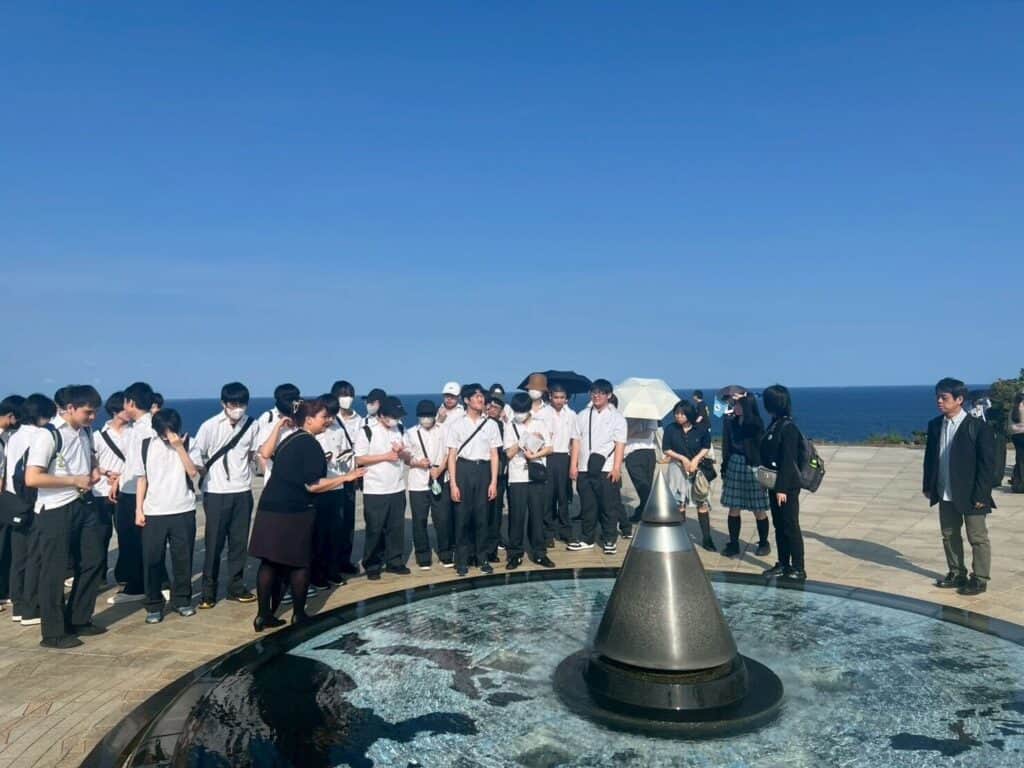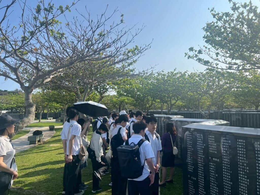初めて飛行機に乗る生徒も多く、出発前には緊張した表情も見られましたが、友人同士で声を掛け合う姿もあり、期待に満ちた雰囲気の中で旅がスタートしました。全員無事に沖縄へ到着し、まずは平和学習へ向かいました。