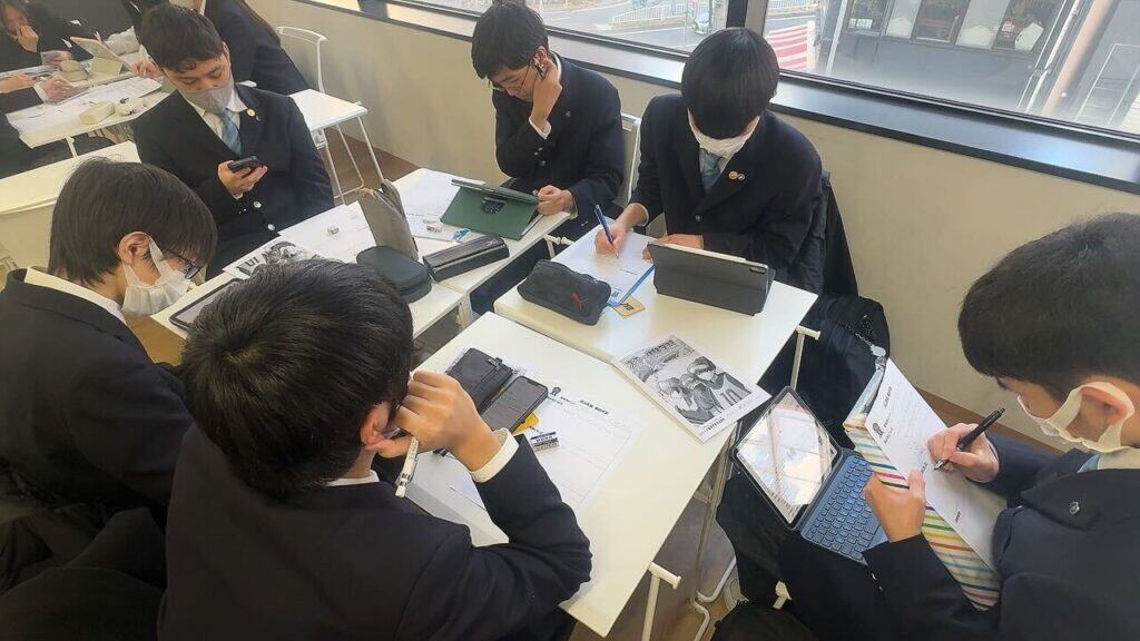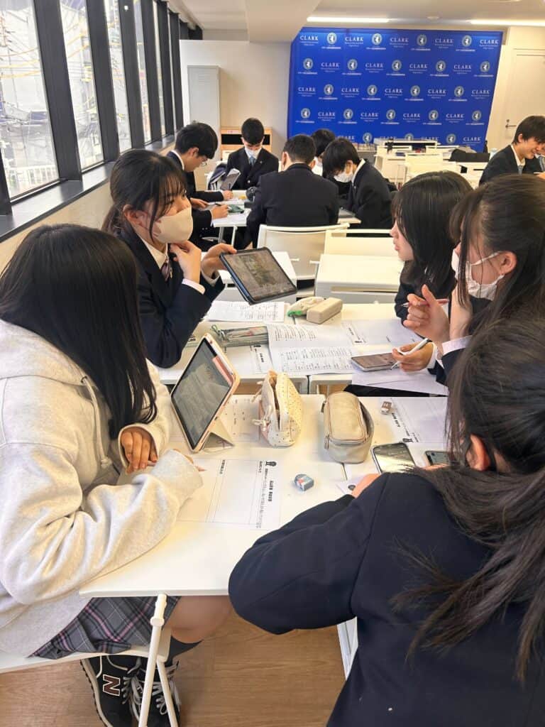 スキーが初めての生徒もおり、少し緊張した面持ちでしおりを一生懸命読み込む様子が見られました。活動内容や注意事項を確認しながら、これから始まる行程に期待と不安を膨らませている様子でした。最後には高山散策の班に分かれ、行きたいお店や食べたいものを調べながら、友達同士で意見を出し合い、楽しそうに話し合っていました。