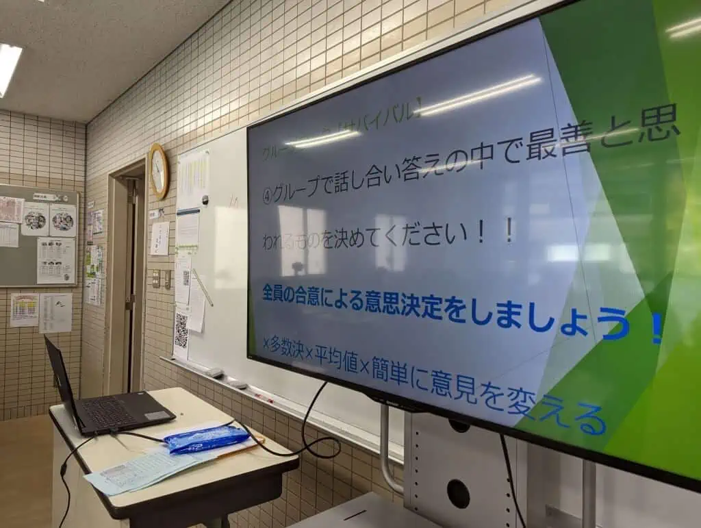 授業では、生き残るために必要なものについて自身の考えをもって自身で選択をし、その選択をグループで話し合いをしてグループでの1つの答えを出すというものを実施しました。