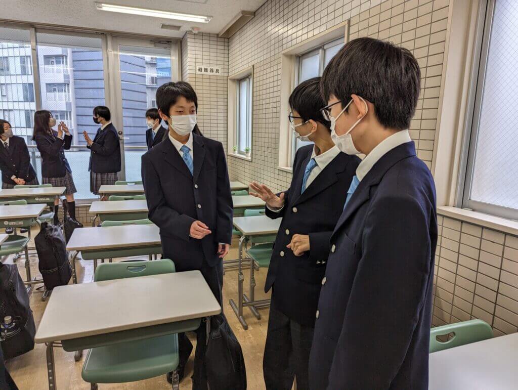 玄関では、ネイティブの先生たちも英語でみんなに挨拶をしていました。生徒たちも慣れない英語でのあいさつを返してくれていました。日本人の先生とネイティブの先生とに英語と日本語をしっかりと使い分けていました。