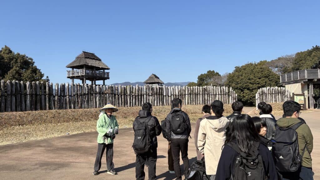 広大な敷地に復元された住居や物見やぐら、環濠集落の風景を前に、生徒たちは弥生時代の人々の暮らしに思いを巡らせながら、ガイドの説明に耳を傾けていました。教室で学んだ歴史が、目の前の風景と結びつくことで、知識がより実感を伴ったものへと変わっていく様子が印象的でした。