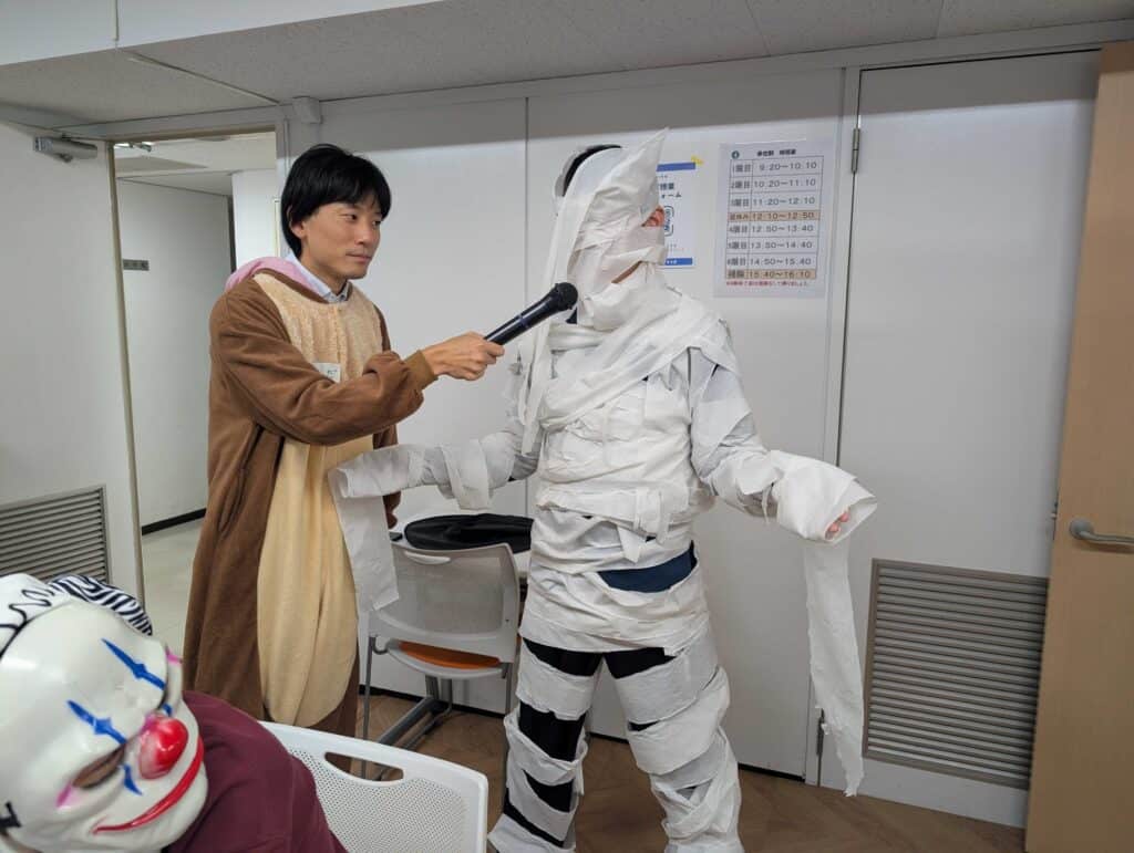 イベントではゲームとしてグループの生徒をミイラに仕立てて芸術点を競ったり、お菓子を交換したりしました。ミイラになった生徒もインタビューを受け、楽しいなど感想を語っていました。