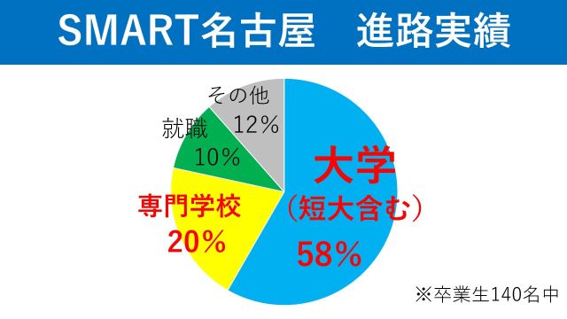 スマート名古屋では、昨年度の進路実績は大学進学率が58%と多くの生徒が大学進学を希望し、進学をしています。 (卒業生140名中)
