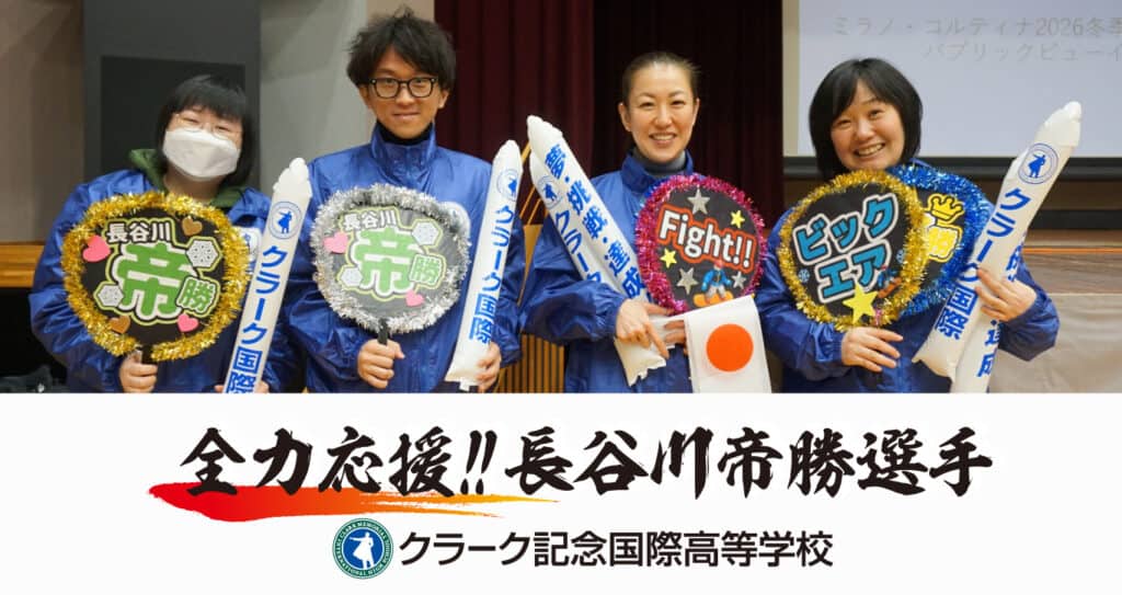 長谷川帝勝選手の地元・**岩倉市**にて開催された、ミラノ・コルティナ2026冬季オリンピックのパブリックビューイングに、本校クラーク記念国際高等学校の職員も参加し、地元の皆さまとともに応援しました。