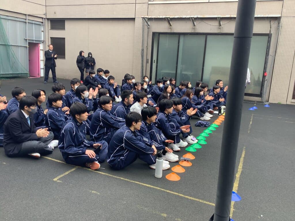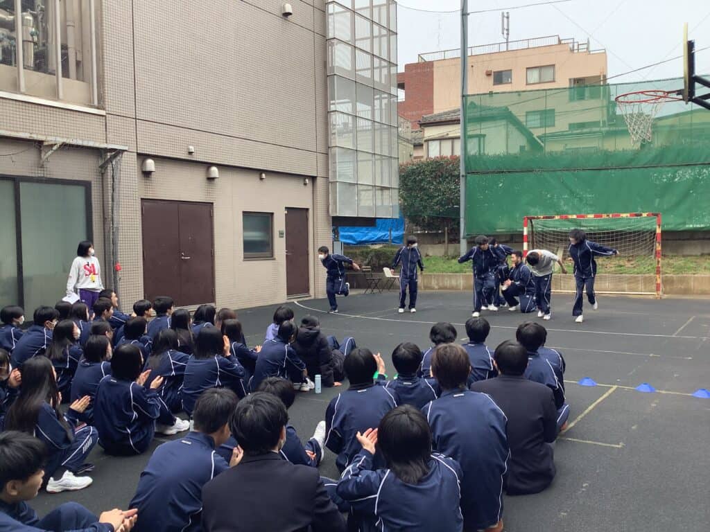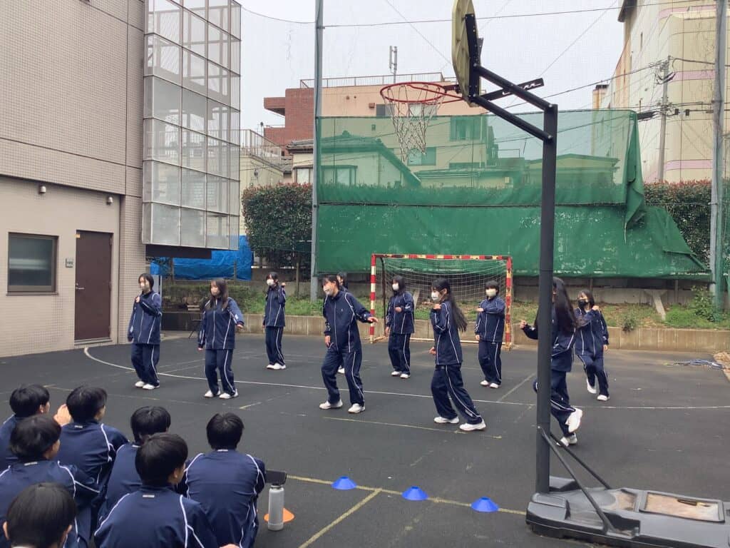 2026年3月13日、千葉キャンパスの中庭で、1学年の体育授業で取り組んできたダンスの発表が行われました。少し緊張しながらも、楽しそうに踊る生徒たちの姿が印象的な時間となりました。