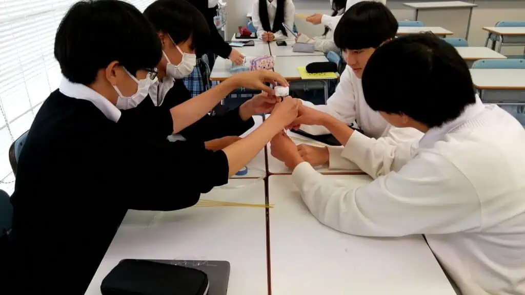 1年生のキャリア学習の時間では、協調性について学習しました。一人だけではなく周りの人達との協力が不可欠ということを動画やパワーポイントで学んだ後に、協調性の大切さを実感するためにマシュマロチャレンジを行いました。マシュマロチャレンジとは、パスタとテープを使い自立可能なタワーを立て、頂上にマシュマロを置いて高さを競うものです。