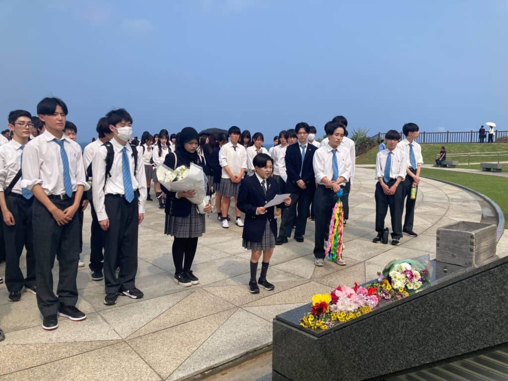 千葉キャンパスでは、生徒のアンケートによって行き先を決めています。ここ最近は関西方面が圧倒的人気でしたが、今年の3年生は沖縄になりました。朝早くの集合でしたがみんな元気いっぱいです!1日目の今日は平和学習を行いました。平和祈念公園、ひめゆり資料館に行き、当たり前に過ごせている「今」に感謝の気持ちを持ちたいと思います。