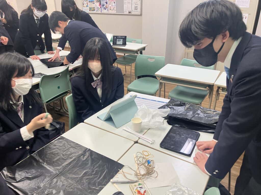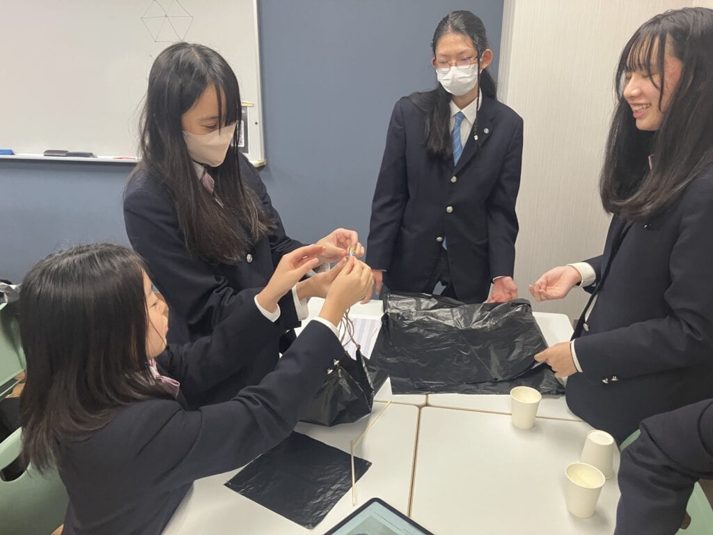 柏キャンパスでは「乾電池Satパラシュートゲーム」を実施しました。「着地制御」をテーマに、生徒たちは班ごとに工夫を凝らし、乾電池を安全に着地させるためのパラシュート装置を制作しました。クラス対抗形式で行われ、設計の発想力や実験の精度、チームワークが試される熱戦となりました。