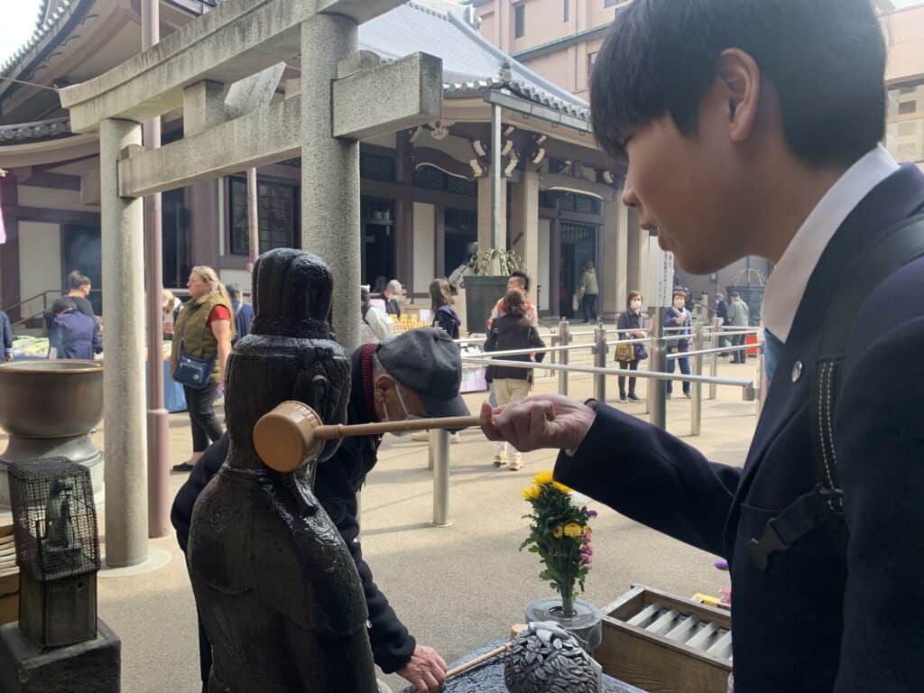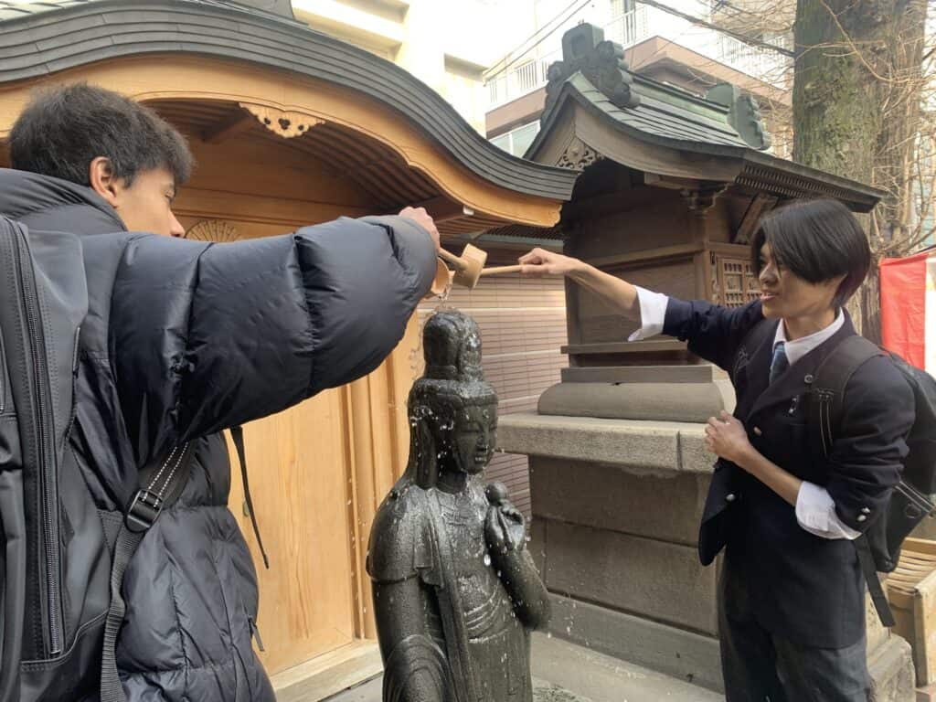 今回の紹介する講座の一つは、「巣鴨で縁日あるけど塩大福食べに行かない?」という、まるで放課後の気軽なお誘いのような講座です。しかし、実際に一歩足を踏み入れれば、そこには深い「街道文化」の学びと発見が待っていました。かつて中山道の入り口として旅人を見守ってきた眞性寺の「江戸六地蔵」の存在感に圧倒され、とげぬき地蔵尊(高岩寺)では「洗い観音」を体験。自分の体と向き合いながら丁寧に観音様を拭う参詣者に交じって、生徒たちも真剣に観音様をぬぐっていました。