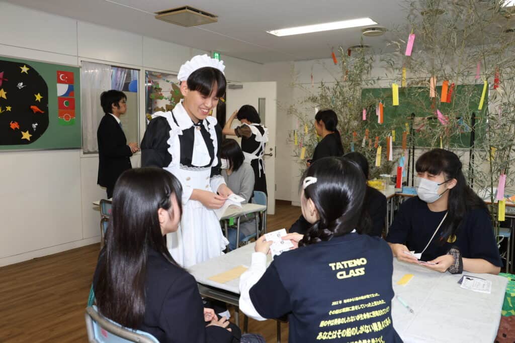 また、有志の男子生徒が“メイド”として接客を担当しました。立候補した生徒たちは、言葉遣いや立ち居振る舞いを何度も練習し、打ち合わせを重ねて当日に臨みました。準備から本番までクラス全員が協力し合い、丁寧に作り上げた「冥途cafe」は、訪れた人々が自然と笑顔になる温かな企画となりました。