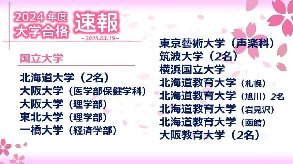 2024年度 大学合格速報!(全国版) 2025 3/24 学習・教育 2025年3月20日 今年も多くのクラーク国際の生徒が「夢・挑戦・達成」を成し遂げました!おめでとう!次のステージでも応援しています! \ CLARK SMART千葉の最新情報 / CLARK SMART千葉へ戻る 学習・教育 URLをコピーしました! 関連記事 【CLARK SMART千葉】「SMART」×「自分と仕事:仕事マップを書いてみよう」 2025年12月10日 【CLARK SMART千葉】「SMART」×「進路探究」特別活動レポート 2025年12月9日 【CLARK SMART千葉】高3生 卒業認定試験──進路と卒業に向けた大切な節目 2025年12月8日 【CLARK SMART千葉】「SMART」×「探究学習」校内成果発表会に向けて──登壇者が準備を進めています 2025年12月7日 <学校説明会>1月10日(土)「SMART」×「学校説明会」新中3生対象!SMART Studyコースの学校説明会を開催いたします! 2025年12月1日 【個別相談開催】中学生・高校生対象(2026年1月1日以降転入生)《予約受付中》 2025年11月21日 【CLARK SMART千葉】授業紹介「SMART」×「ピアアシスタント」──仲間を支え、学び合う力を育てる 2025年11月19日 【CLARK SMART千葉】授業紹介「デザイン」──トリックアートに挑戦! 2025年11月13日