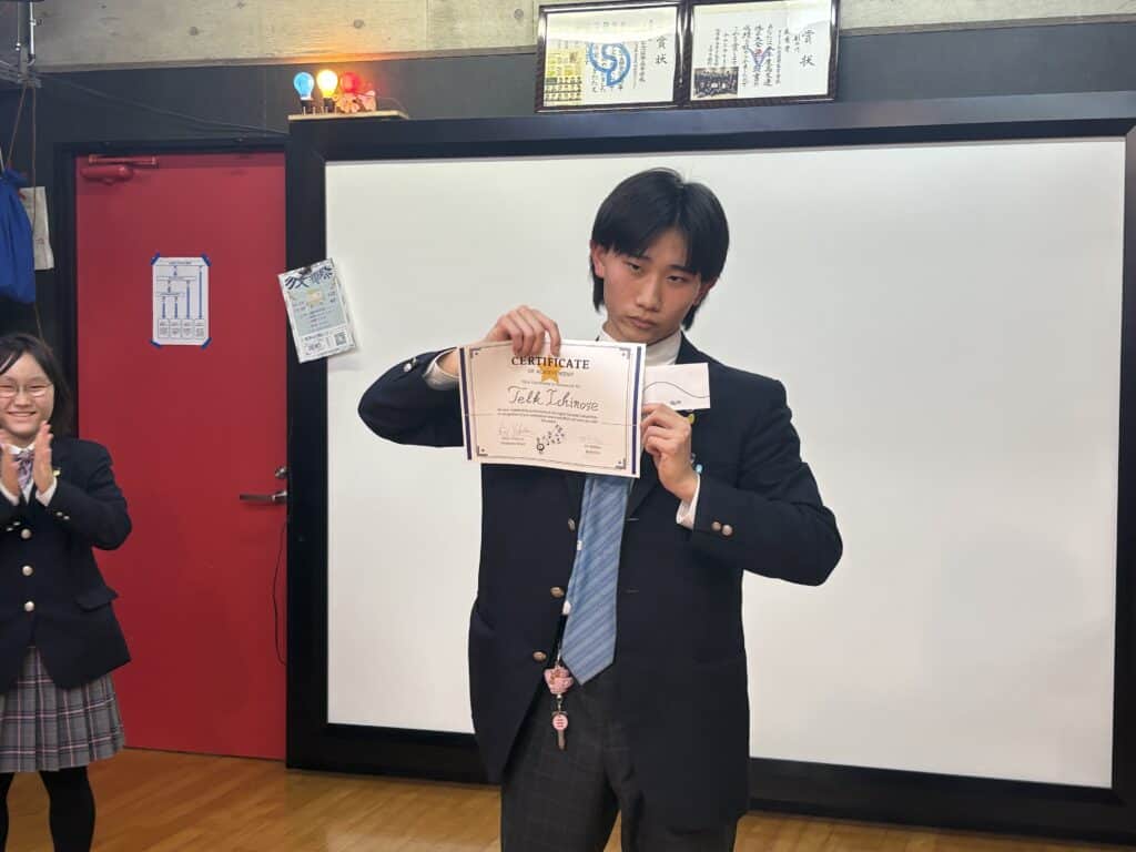 審査員の先生方からは、「発音がクリアで聞き取りやすかった」「歌詞の意味を理解して歌っていたのが伝わった」「英語を楽しむ姿が素晴らしかった」といったコメントをいただきました。結果発表では、力強い歌声と表現力が高く評価された3年の一ノ瀬くんが第1位、英語のリズム感と伸びやかな声が評価された3年の是枝くんが第2位となりました。