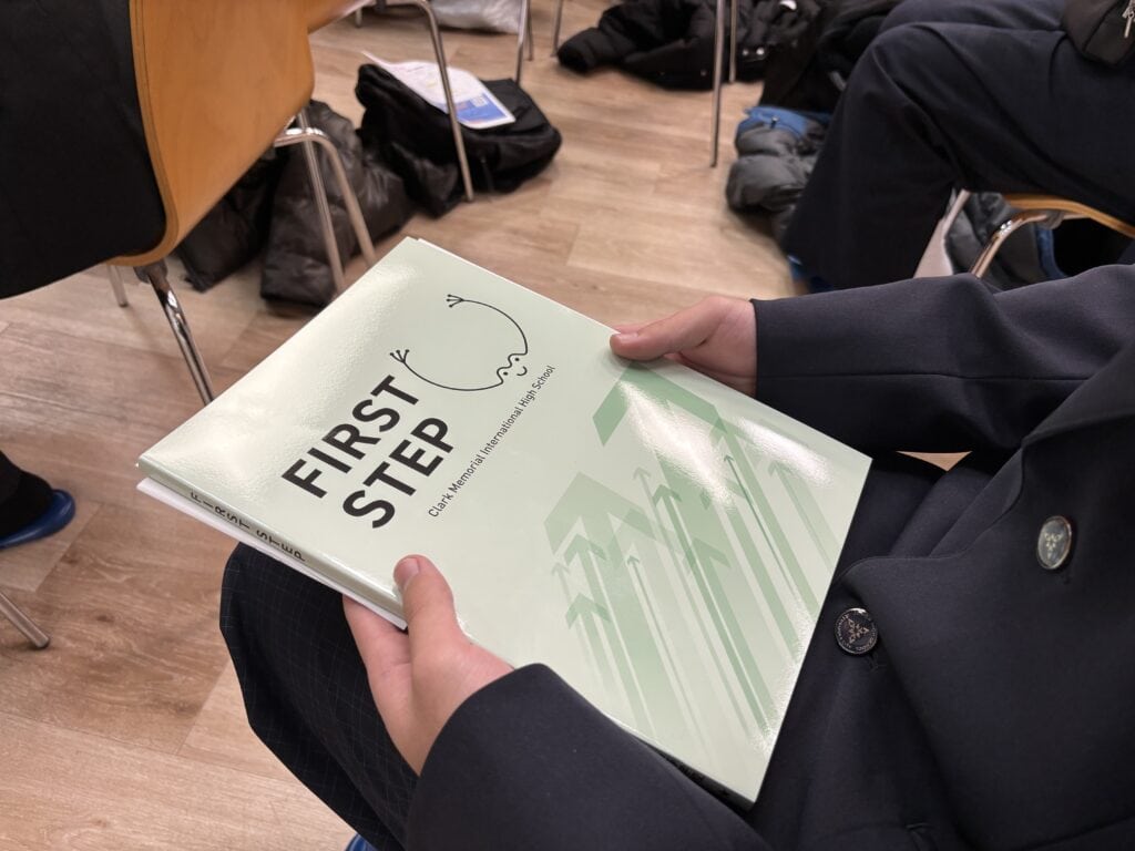 続いて、中学校の学習内容を振り返る問題集「ファーストステップ」について説明を行いました。今後は自宅での学習に加え、クラークで先輩たちと一緒に取り組んでいきます。