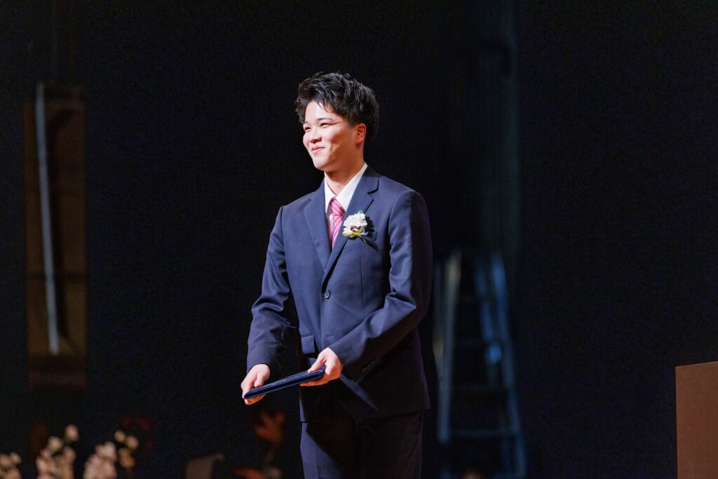 126名全員の名前が呼ばれるたびに、会場に温かい拍手が広がりました。キャンパス長から一人ひとりに手渡される卒業証書。証書を受け取るために歩くその瞬間、コーチング担任が一人ひとりの書いた言葉を読み上げました。目標への思い、仲間や先生への感謝、これからの夢。飾らない言葉が、会場いっぱいに届けられました。