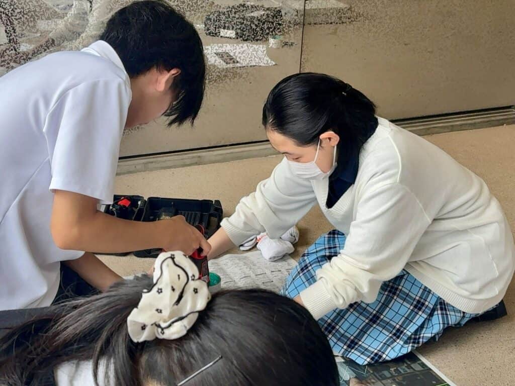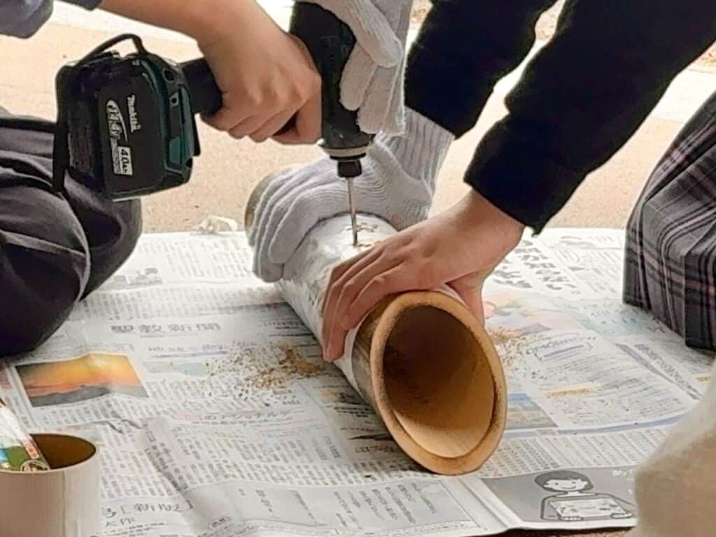 地元の町内会とコラボして”竹あかり作り”に授業でチャレンジしました。大きな竹に描いたデザイン画を貼り付けて、電動ドリルでたくさんの穴をあけるのですが、竹もそれなりに強靭で、完成するまで時間もかかりました。参加者同士で協働性をもち見事完成しました♪