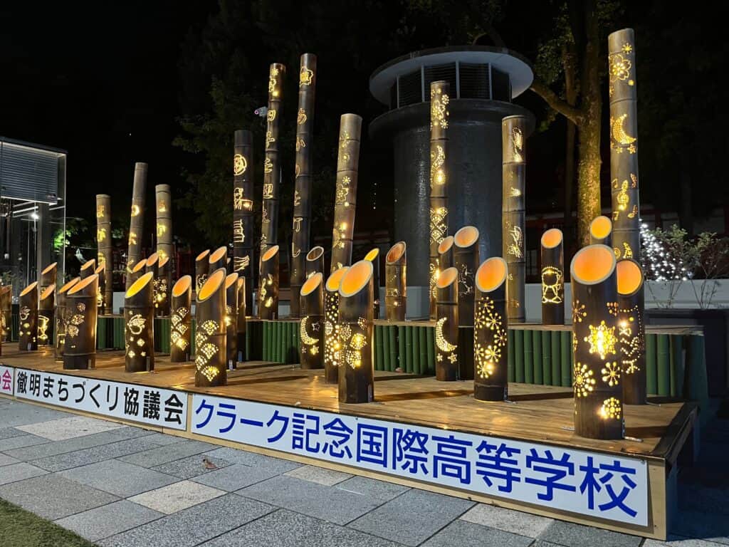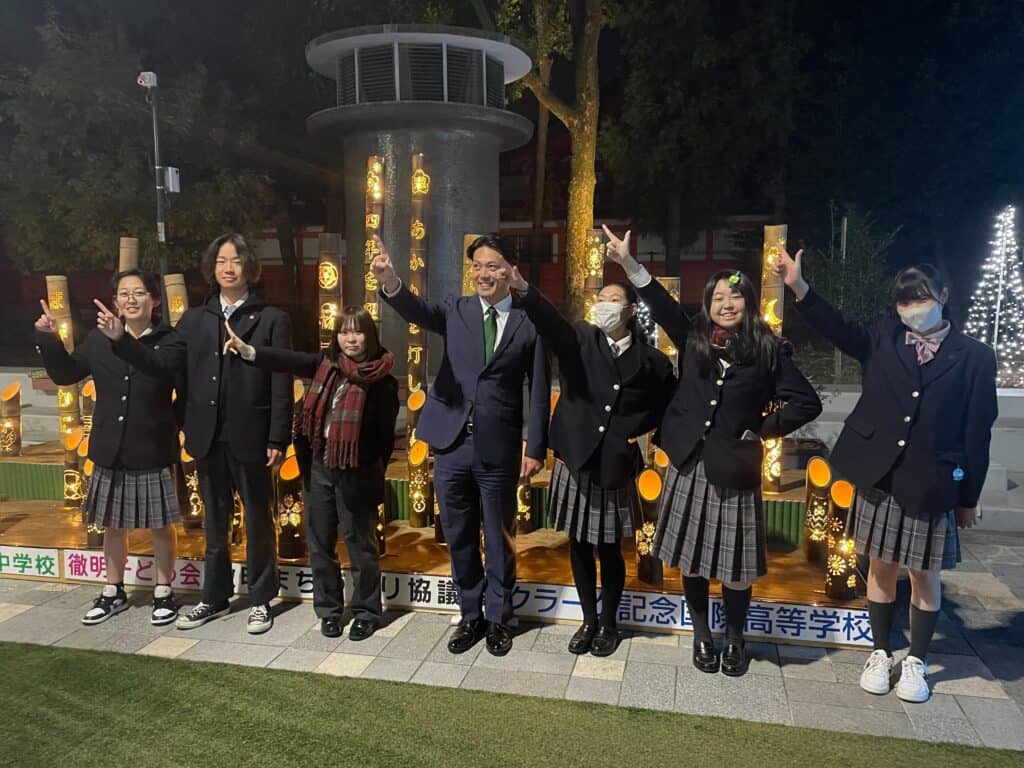 選択授業の一つ「SDGs」では、地元町内会と連携して”竹あかり作り”に取り組んでいました。その制作した作品が11/14、‘’駅とまちを光でつなぐ杜のイルミネーション‘’の点灯式でJR岐阜駅から金公園までで、7回目の今年は、去年より4万球多い過去最多の20万球の電飾が設けられる中、金公園に飾られ、岐阜市長さんたちによる点灯式が行われ、生徒たちも参加してきました。自分たちで作り上げたものが飾られ、達成感も表現力を達成できていました。