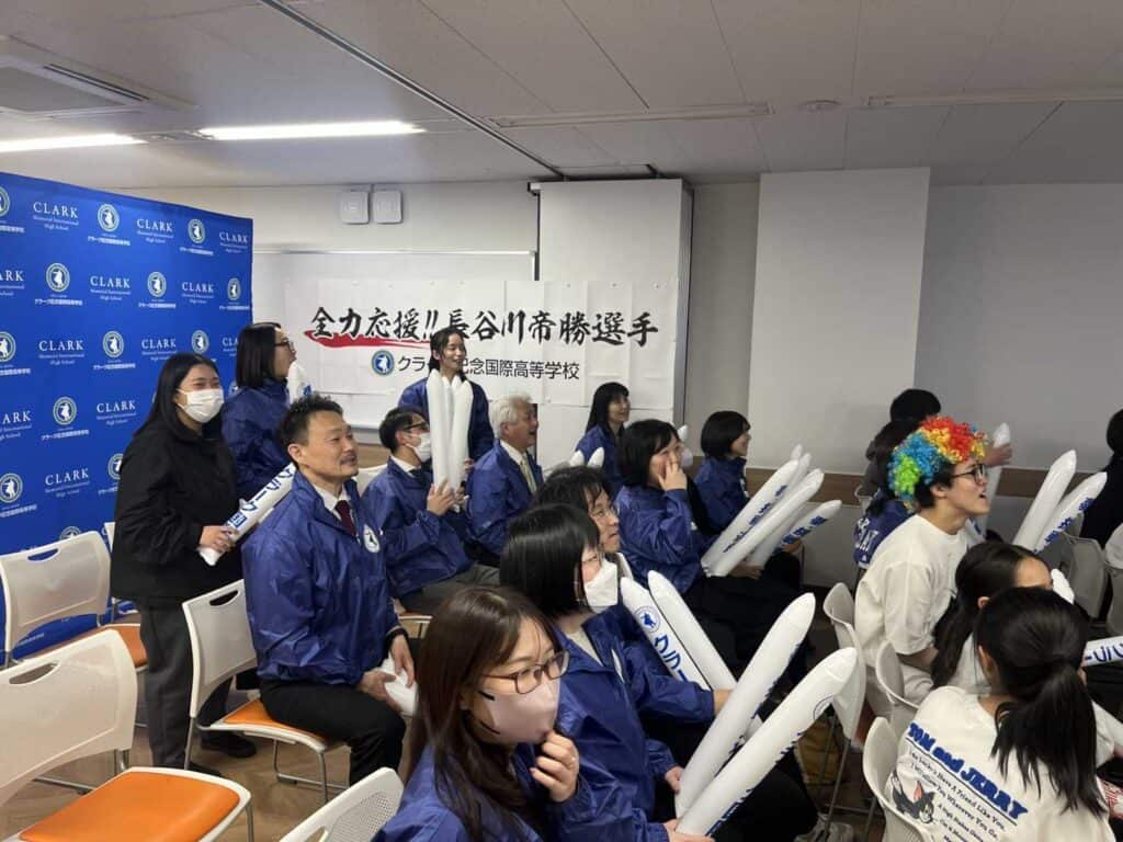 クラーク卒業生・長谷川 帝勝選手、ミラノ・コルティナ五輪 スノーボード男子スロープスタイルの決勝戦応援にCS名古屋でのパブリックビューイングへ駆け付けました!なんとみんなの前で銀メダル獲得!! 決勝前の長谷川選手に送った応援ビデオも長谷川選手は滑走前にも見てくれたのが力になったようです!本当におめでとうございます!!