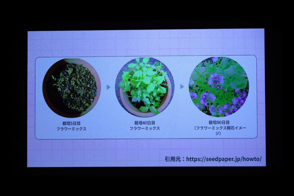 発表内容…規格外食材を活用したガム。シードペーパーを漉き込み、土に植えると花を咲かせることのできる食べた後にも楽しめるガム。