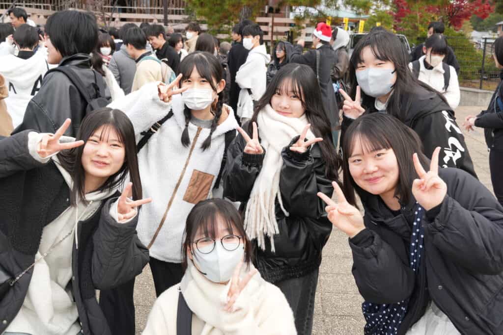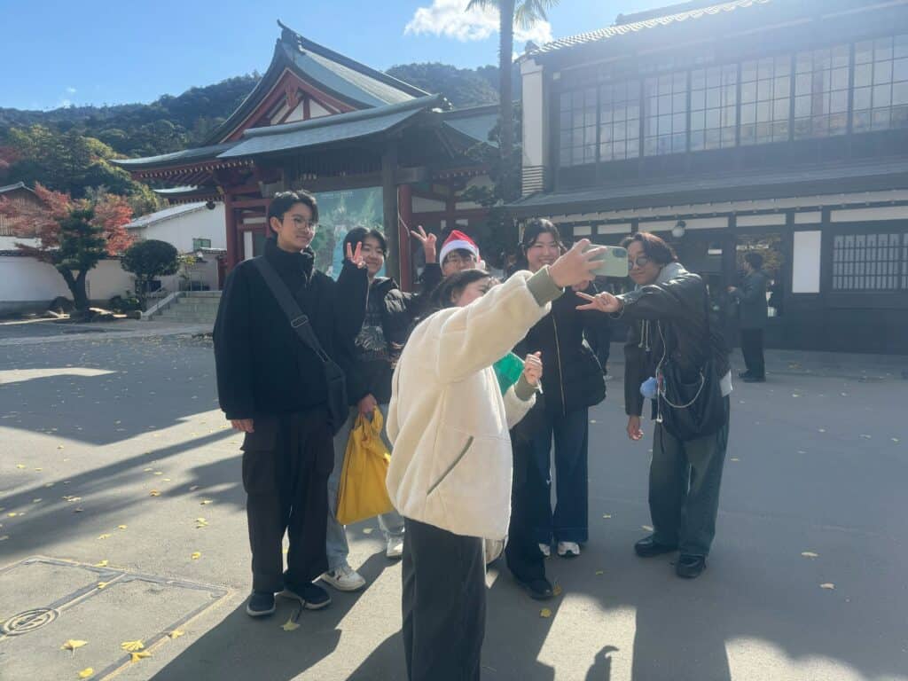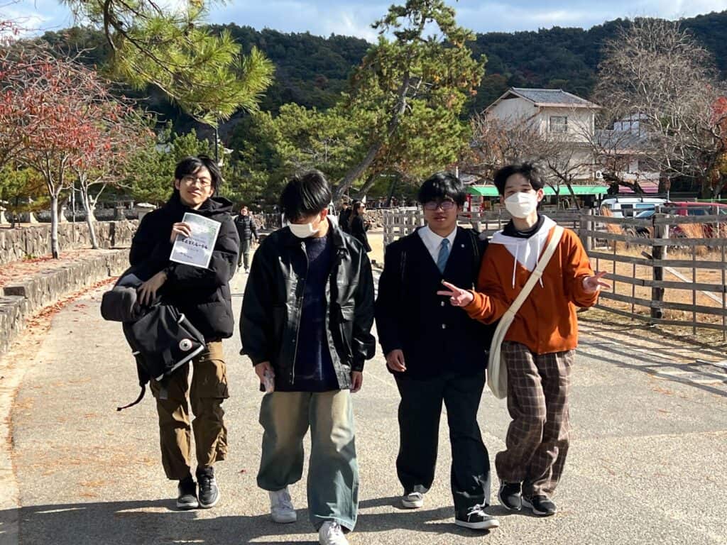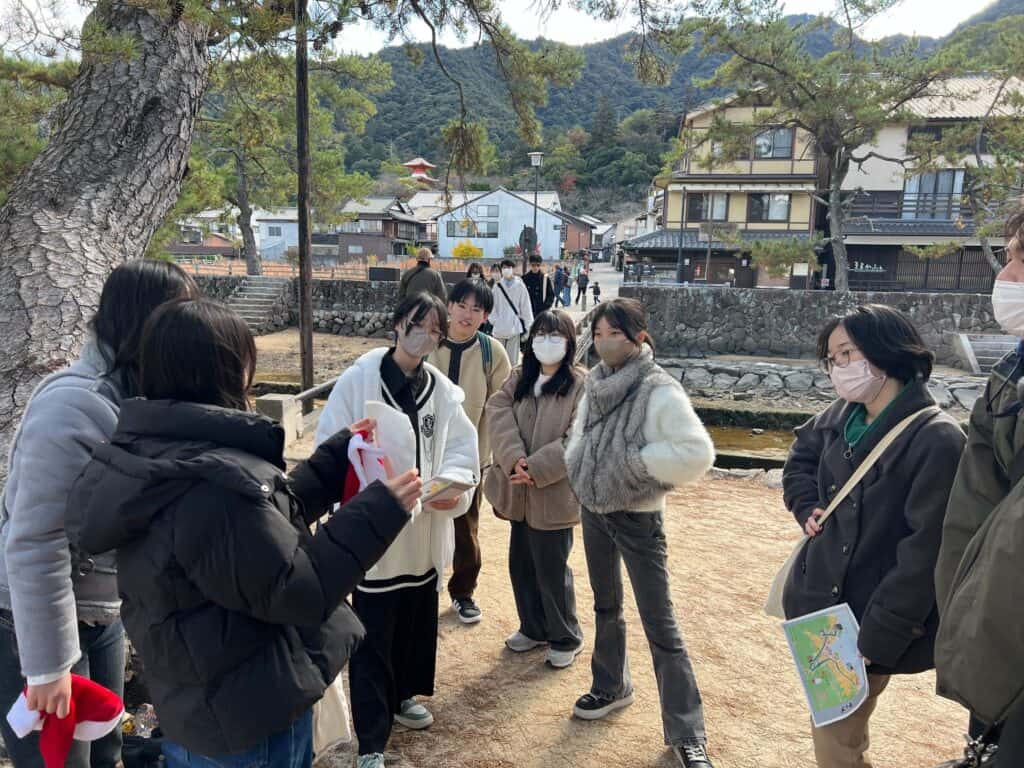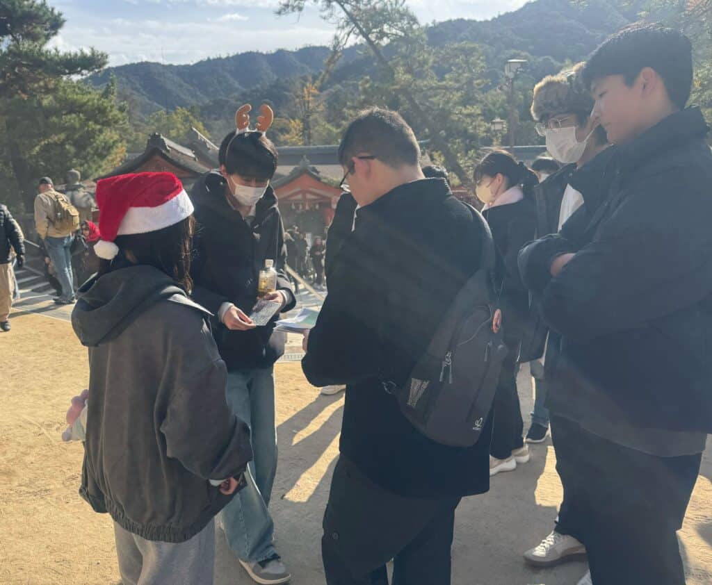 広島キャンパスに集合し、キャンパスからJRとフェリーで宮島まで向かいました!とても寒い日でしたが、生徒たちは元気いっぱいで、道中も楽しそうに過ごしていました!開会式を行い、宮島での活動スタートです!