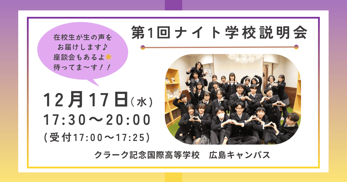 【中学3年生対象学校説明会】次回12月17日(水)ナイト学校説明会ご予約受付中! | クラーク記念国際高等学校