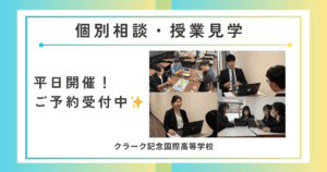 中学3年生対象です!学校紹介・コース説明・学校見学だけでなく、実際に在校生と交流できる場をご用意しています。クラーク国際広島のリアルな日常&雰囲気を体験してみませんか?お申込みお待ちしております★