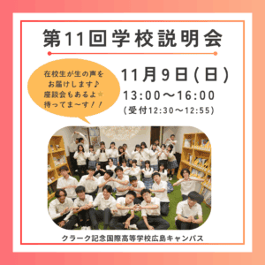 今回の活動だけでなく、クラーク国際広島の学校行事や学校説明会はすべて生徒主体で行っています。ぜひキャンパスに足を運んでいただき、実際の生徒の様子を見に来てください。