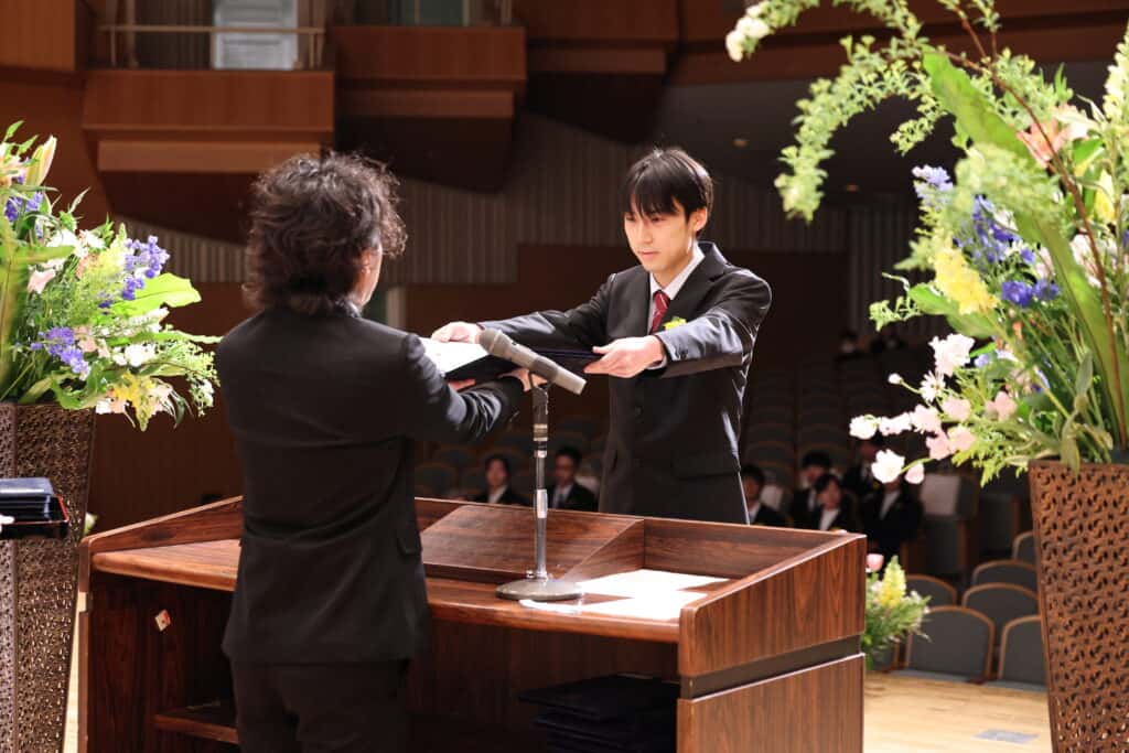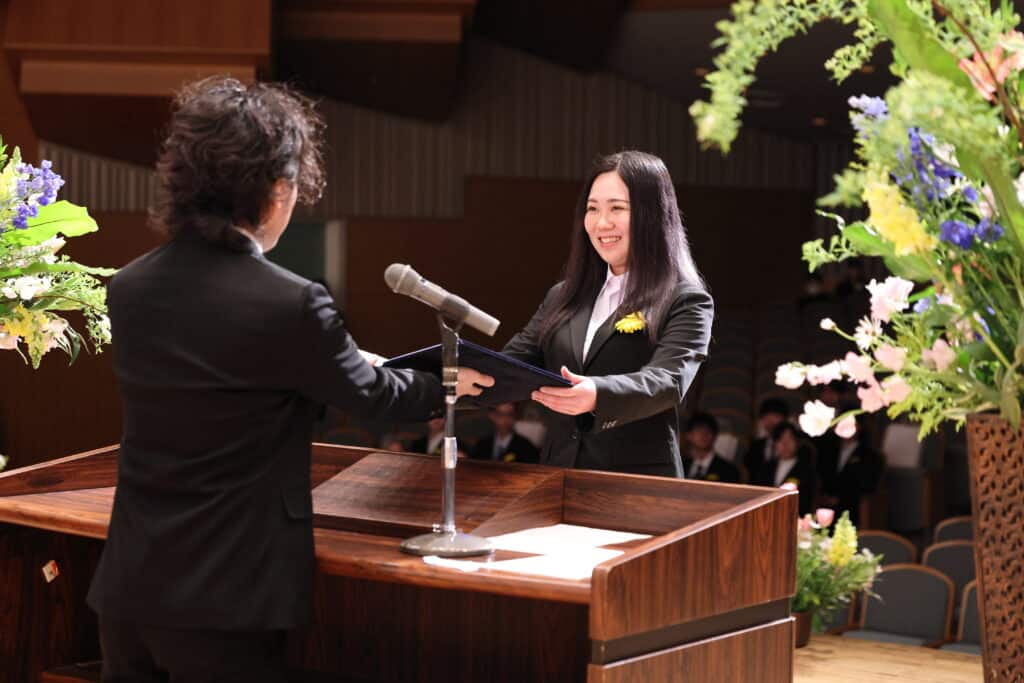 担任が最後の呼名をし、一人ひとりがステージに上がってキャンパス長から卒業証書を受け取りました。皆正装に身を包み、晴れやかな表情でした!