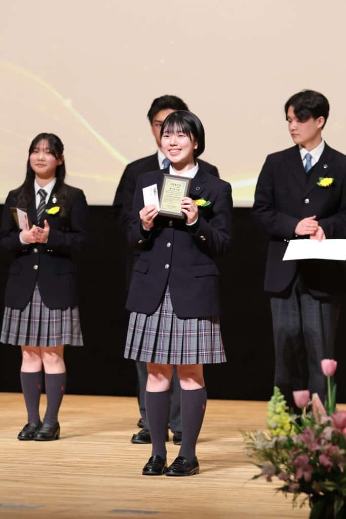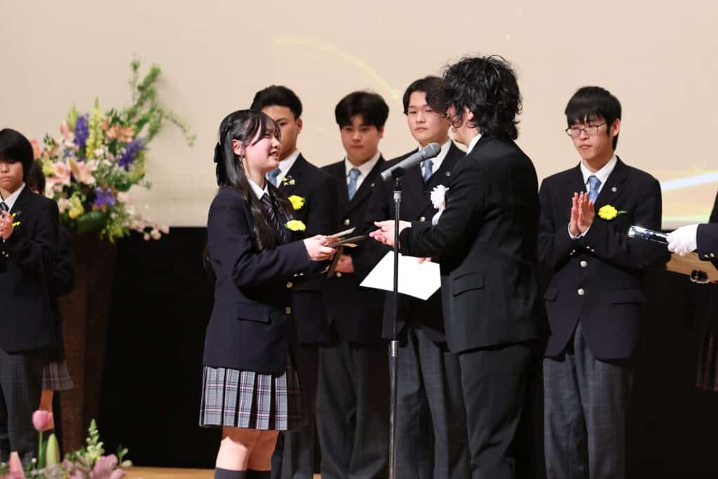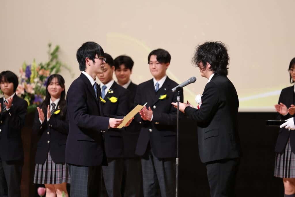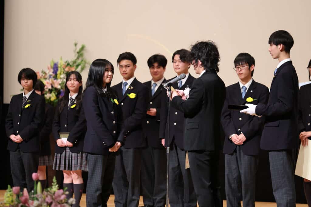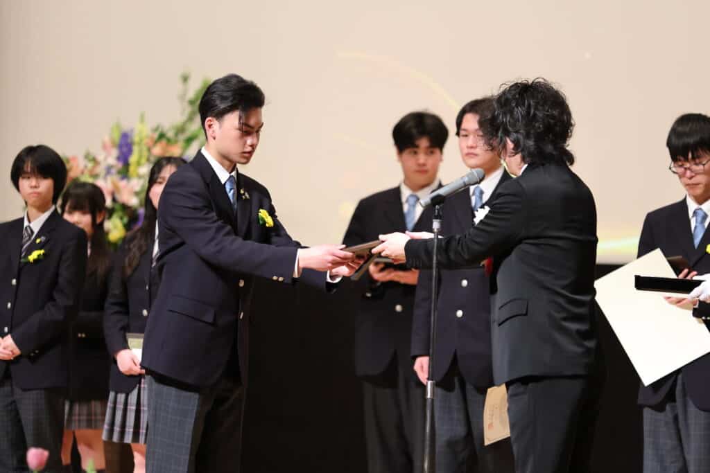 午後の部でも、3年間の努力を称え、表彰が行われました。3年間、1年間の皆勤賞、グローバル大志賞、クラス大志賞、活動優秀賞、学業優秀賞、資格取得賞、社会貢献賞、クラーク大志賞などを受賞した卒業生たちが壇上に上がり、一人ひとり盾や記念品を受け取りました。