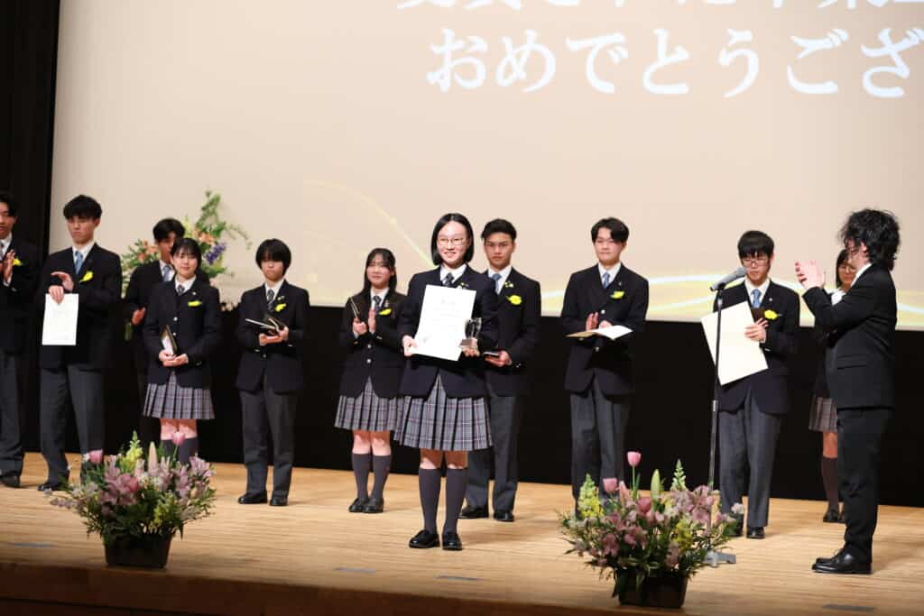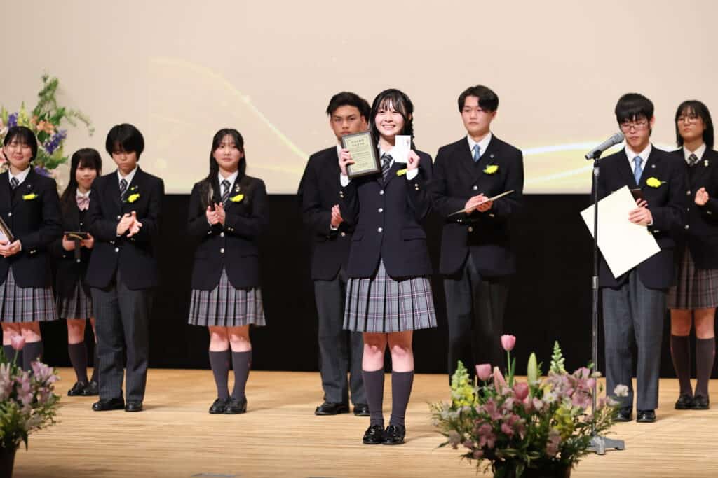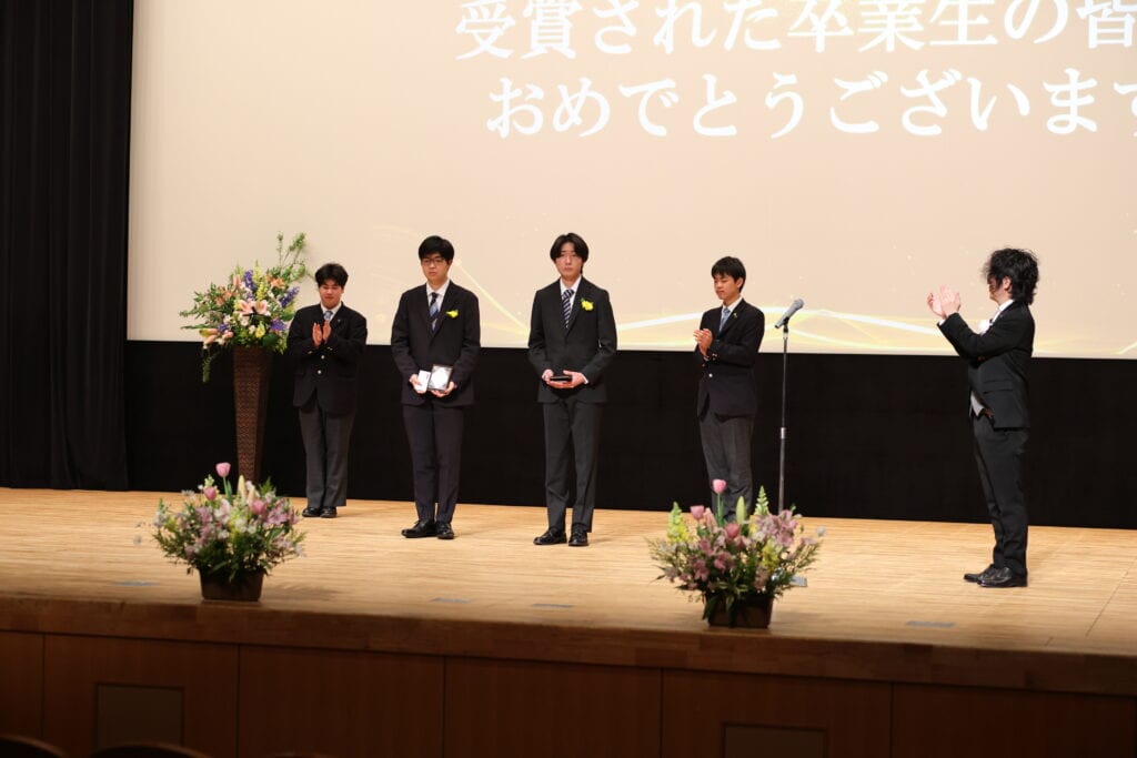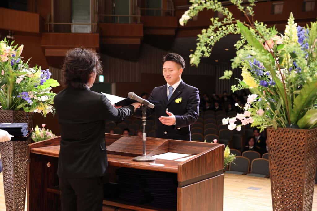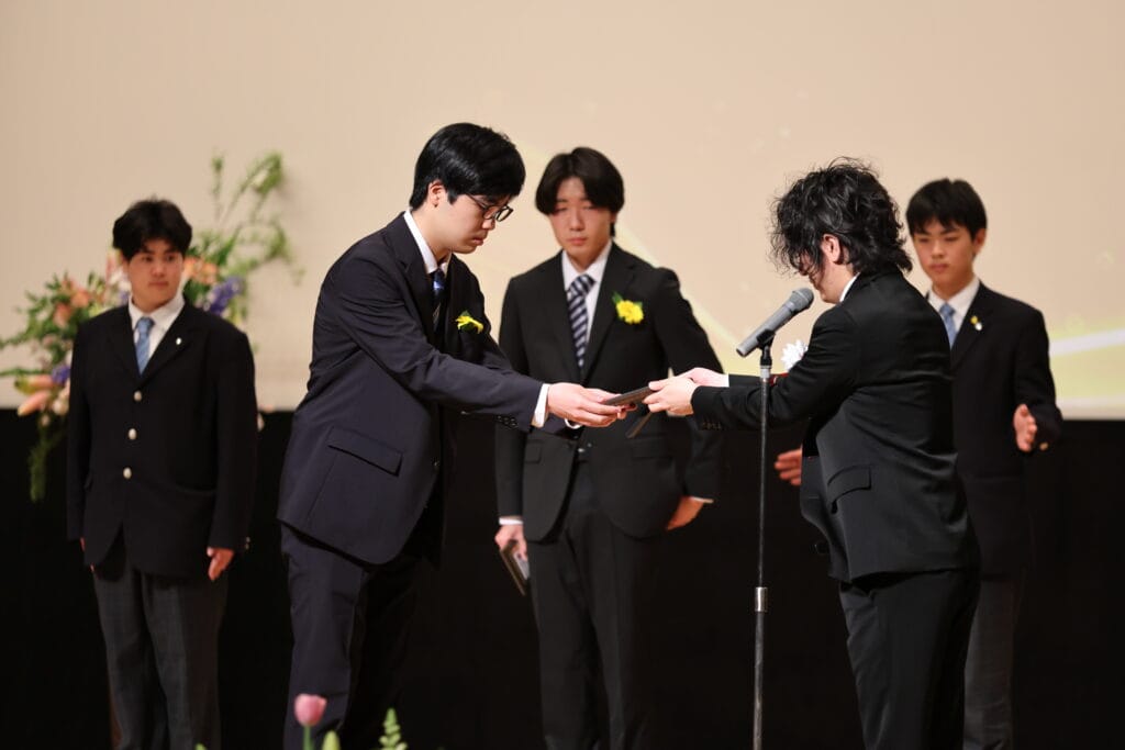 午後の部でも、3年間の努力を称え、表彰が行われました。3年間、1年間の皆勤賞、グローバル大志賞、クラス大志賞、活動優秀賞、学業優秀賞、資格取得賞、社会貢献賞、クラーク大志賞などを受賞した卒業生たちが壇上に上がり、一人ひとり盾や記念品を受け取りました。