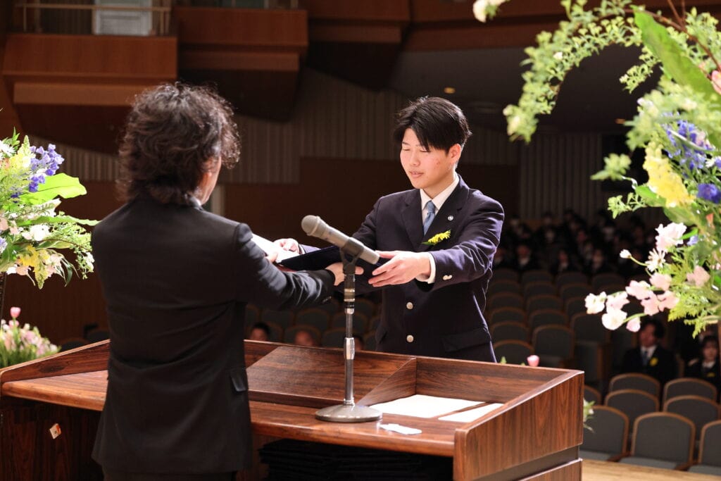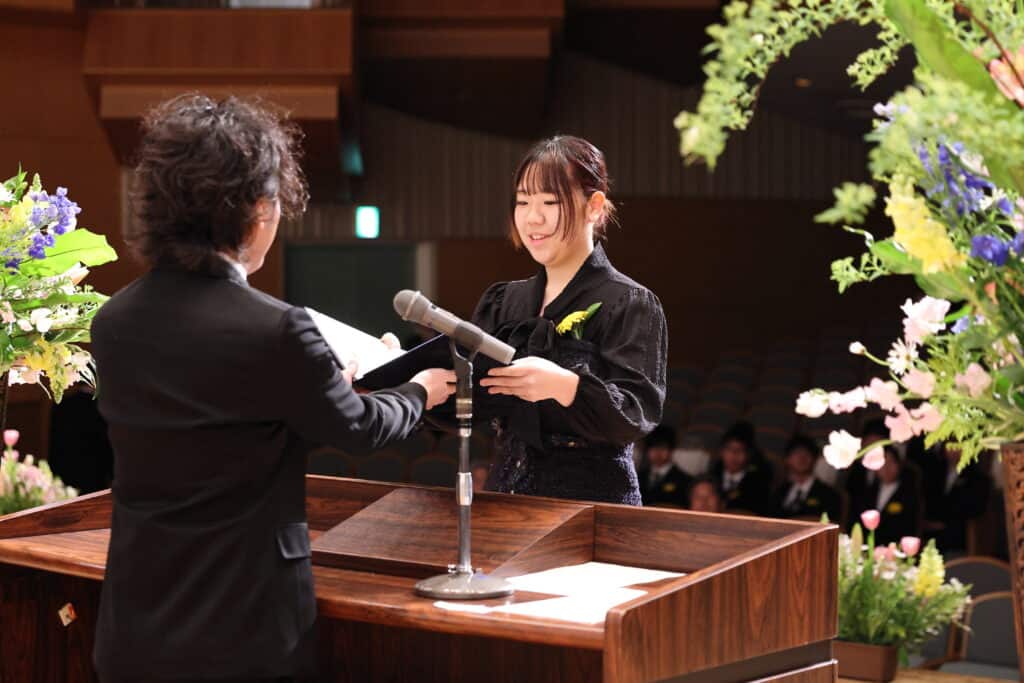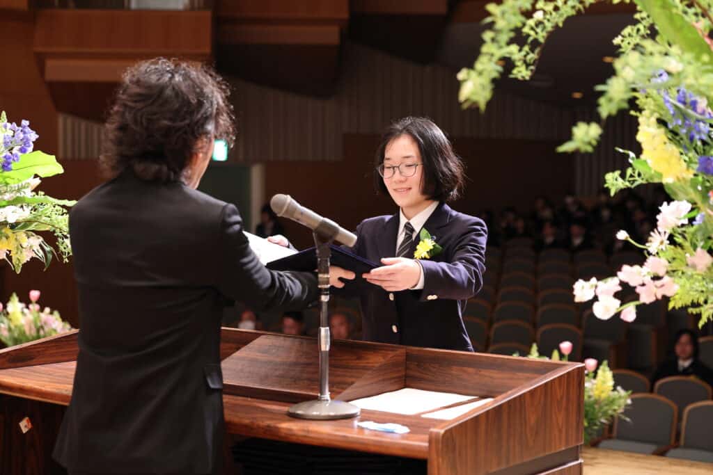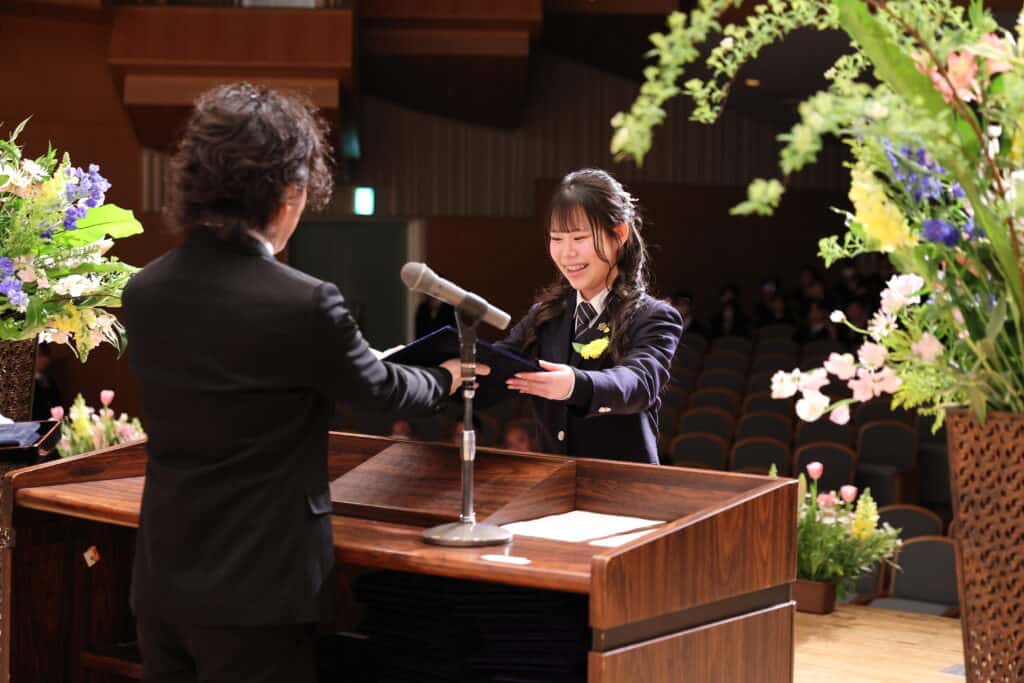 担任が最後の呼名をし、一人ひとりがステージに上がりキャンパス長から卒業証書を受け取りました。クラークの制服を着るのもこれが最後。それぞれ一緒に歩んできた先生からの呼名に返事をし、大きく成長した姿を見せました。