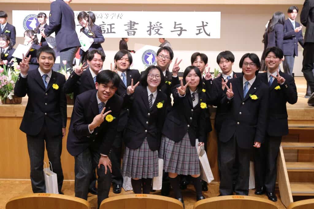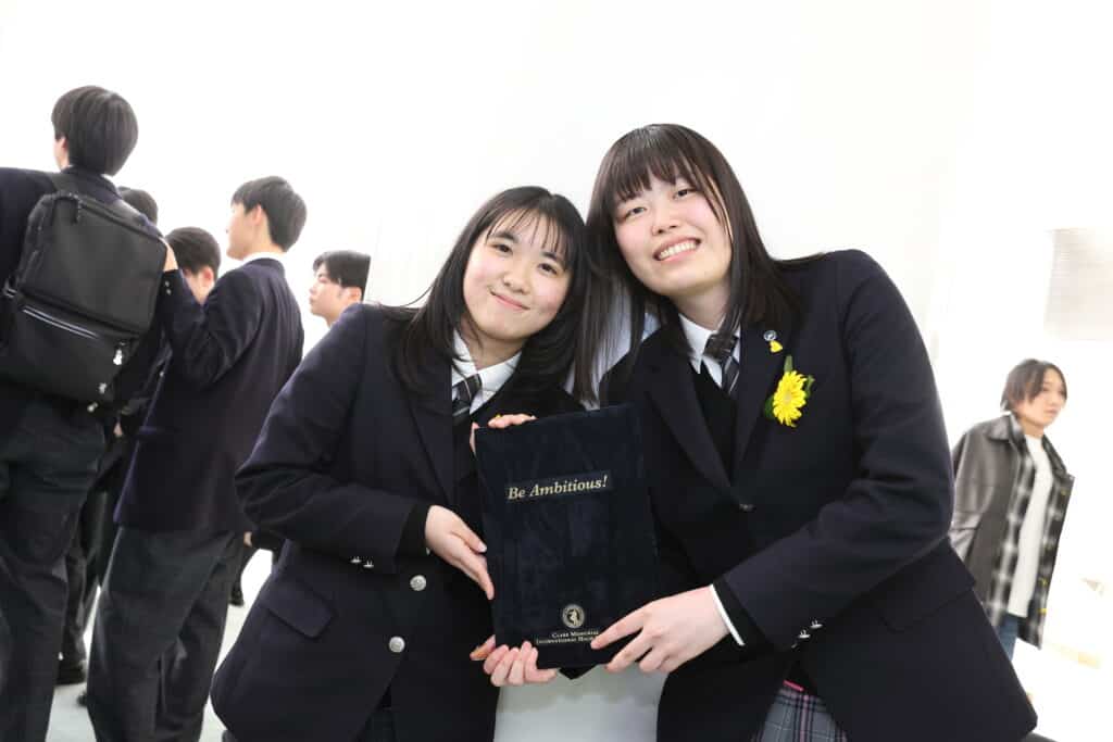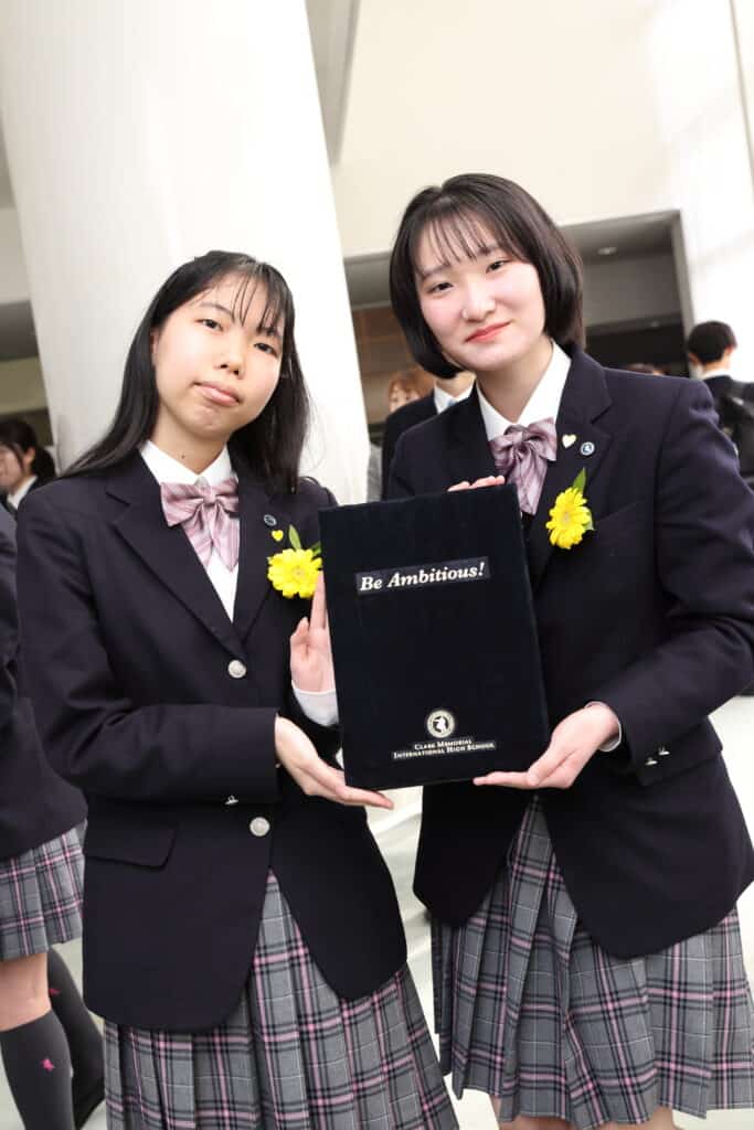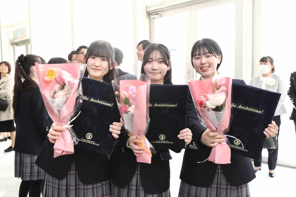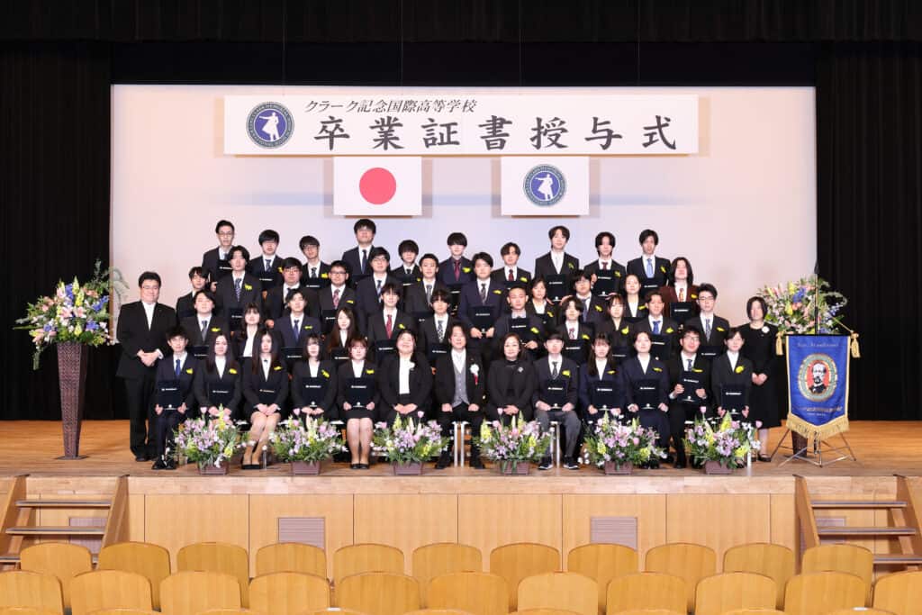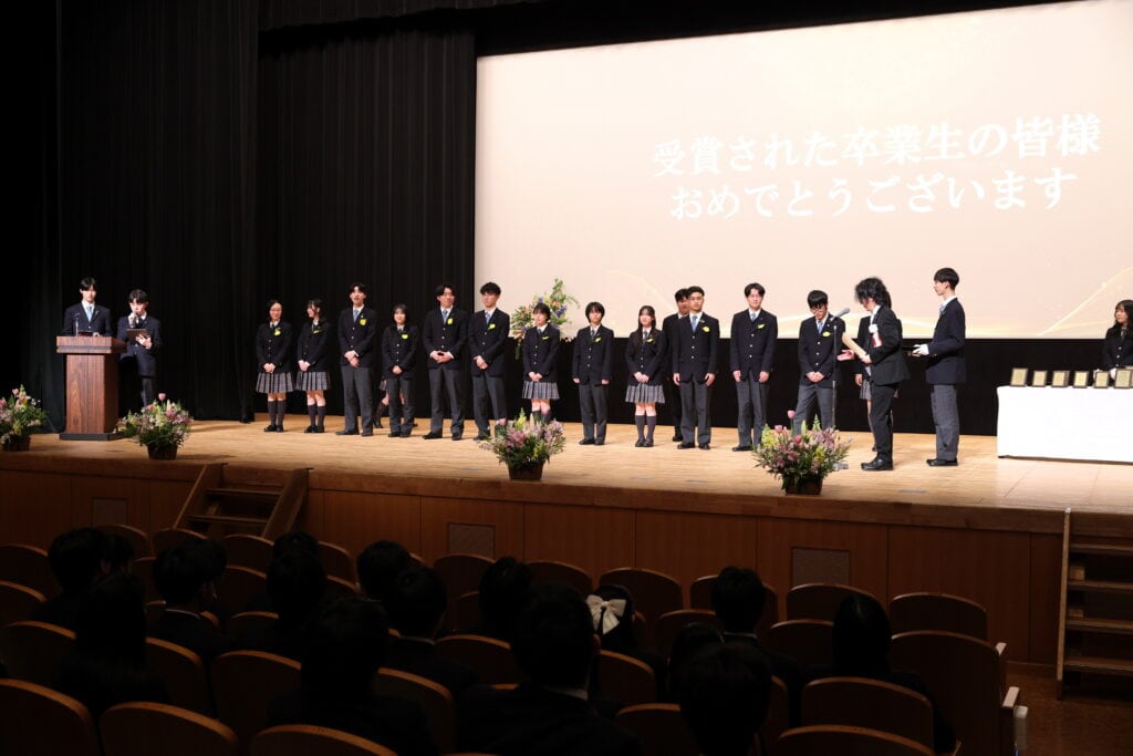 クラーク国際広島キャンパスでは、3年間の努力を称え、様々な表彰をおこなっています。クラス大志賞、学業優秀賞、資格取得賞を受賞した卒業生たちが壇上で表彰されました。