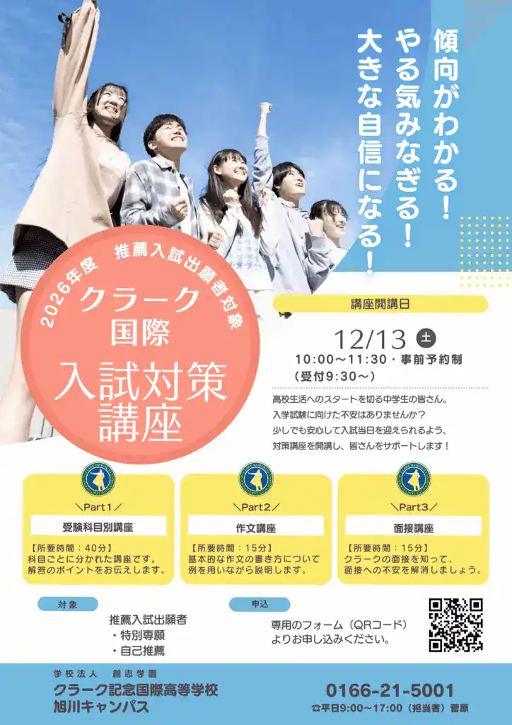 クラーク高校へ出願予定の中学3年生を対象に、入試対策講座を実施します。