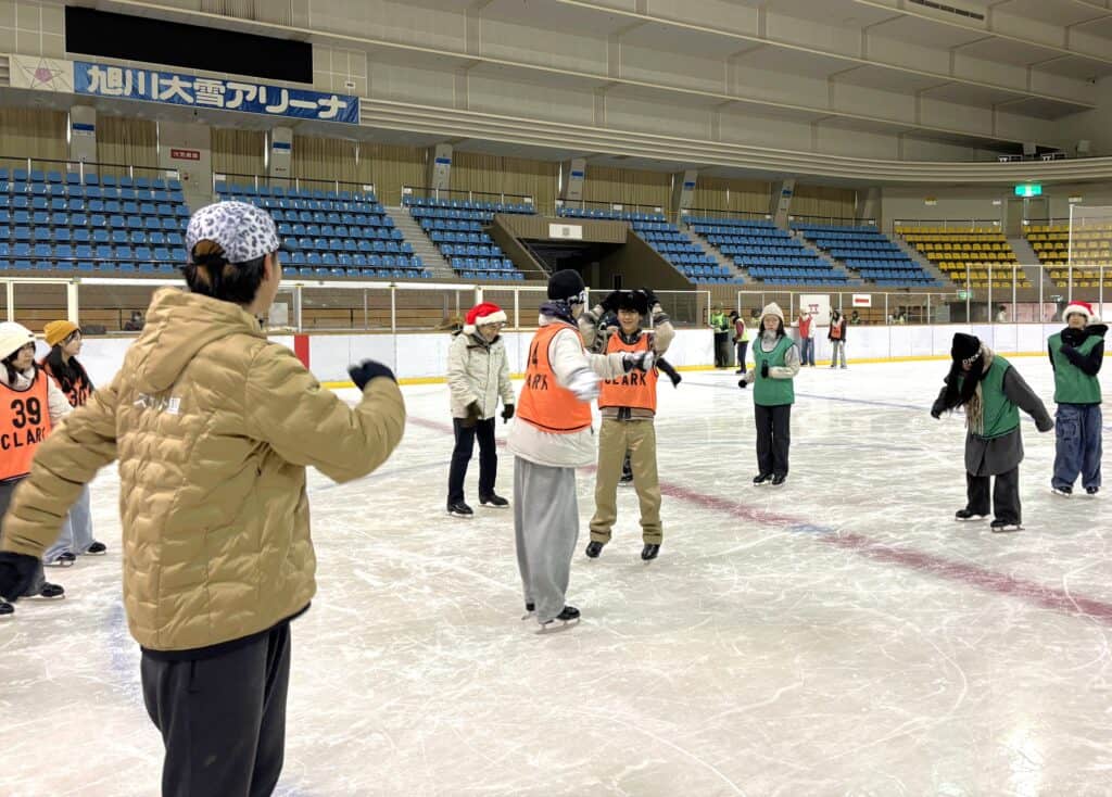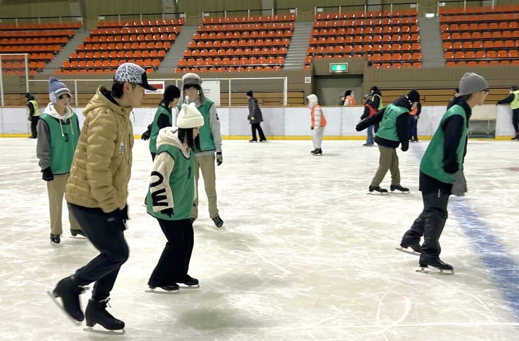 今年はインストラクターの指導のもと、基本姿勢~習熟度に合わせた丁寧な技術指導が行われました。初めて氷の上に立つ生徒も多く、教員や仲間のサポートを受けながら少しずつ前に進み、やがて自分の力で滑り出す姿が見られました。