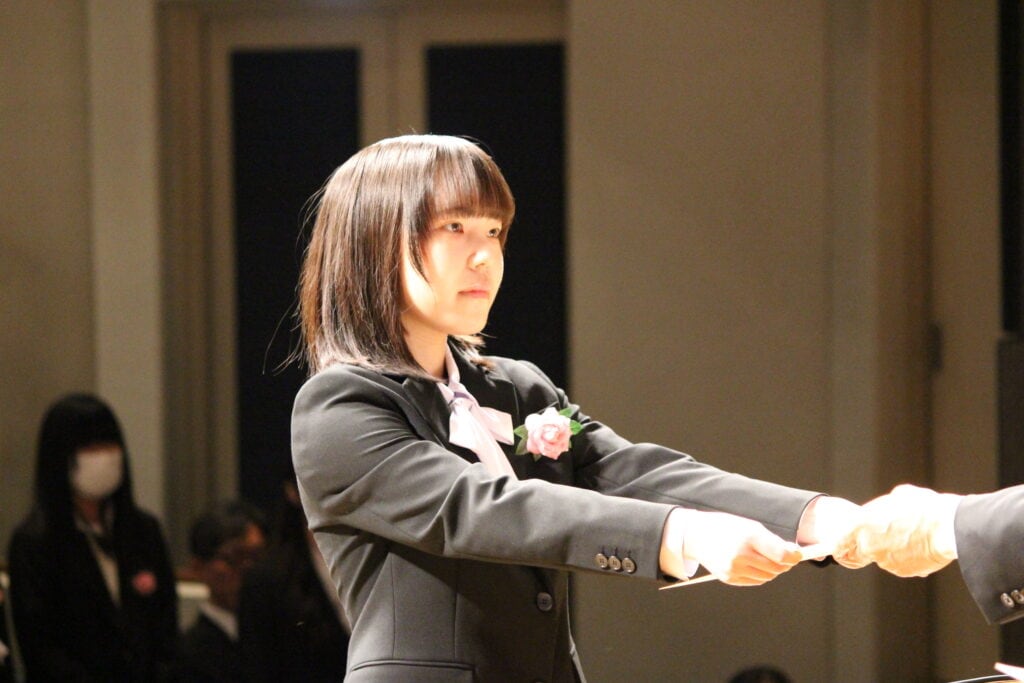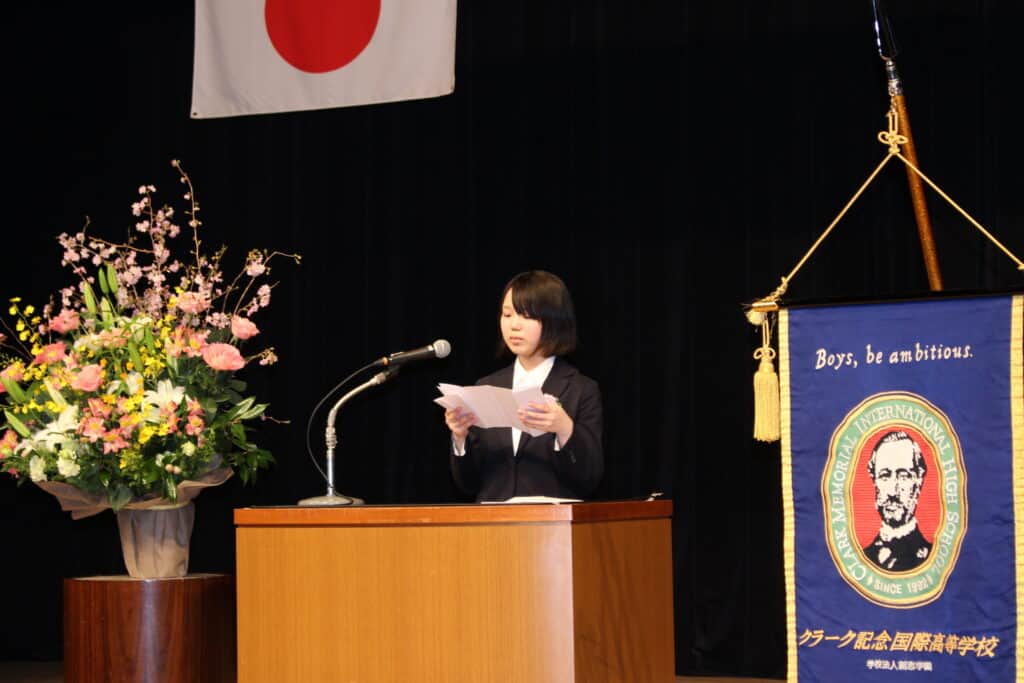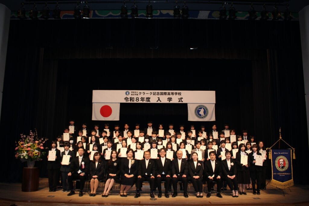 クラーク国際の入学式では、新入生一人ひとりが壇上で入学許可証を受け取る授与式を行っています。生徒たちは前日にリハーサルを行い、慣れない環境や仲間の中で緊張した様子も見られましたが、皆真剣に取り組んでいました。