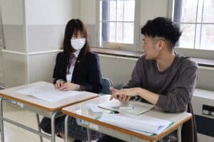 現在はHTMLとCSSのコードの書き方について学習しています。この日はペアを作り、お互いに作業を確認しながら、わからないところを相手に尋ねたり、反対に相手がわからないところを教えたりして作業を行いました。ペアで活動することで、わからないところを教えてもらうだけでなく、自分がわかっているところも相手に教えることで理解を深めることができました。また、ライフイズテックレッスンではゲーム感覚で作業を進められるため、楽しんで授業に取り組むことができます。