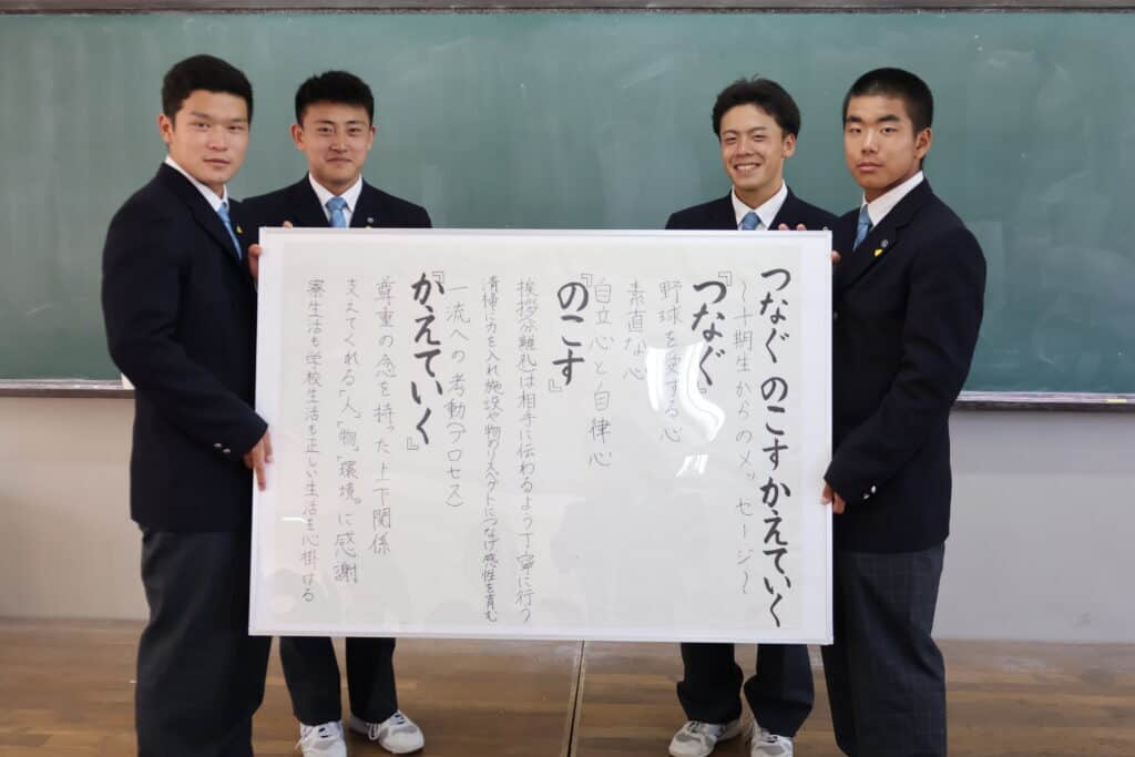 3年生たちはこれまでの3年間を振り返りながら、「つなぐ、のこす、かえていく」をテーマに、自分たちの経験や学びを整理。新チームの後輩たちへ、言葉や形にしてメッセージを伝えました。