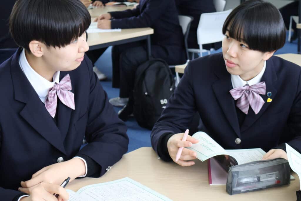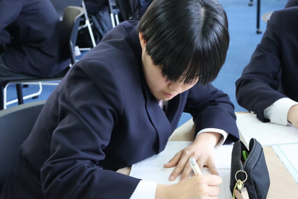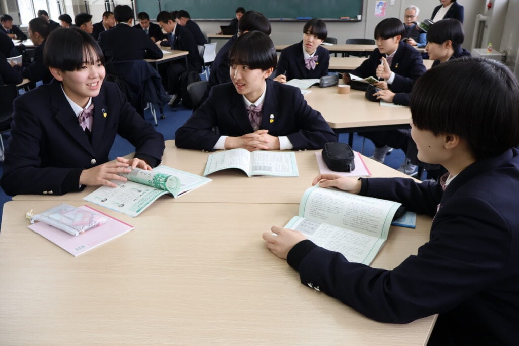 生徒たちは事前に文章を読み、心に残った部分をノートにまとめて参加しました。グループでの話し合いでは、