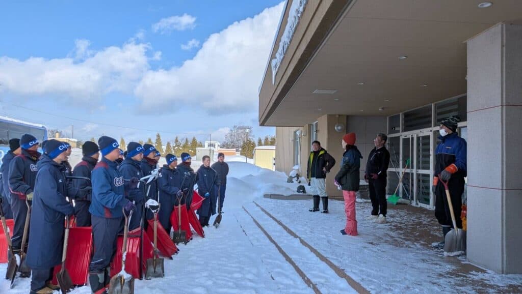 当日は三班に分かれ、それぞれの担当場所へ移動。積雪の状況や安全面に十分配慮しながら、声を掛け合い、協力して作業を進めました。スコップを握る手にも自然と力が入り、日頃のトレーニングとはまた違う形で「チームワーク」の大切さを実感する時間となりました。