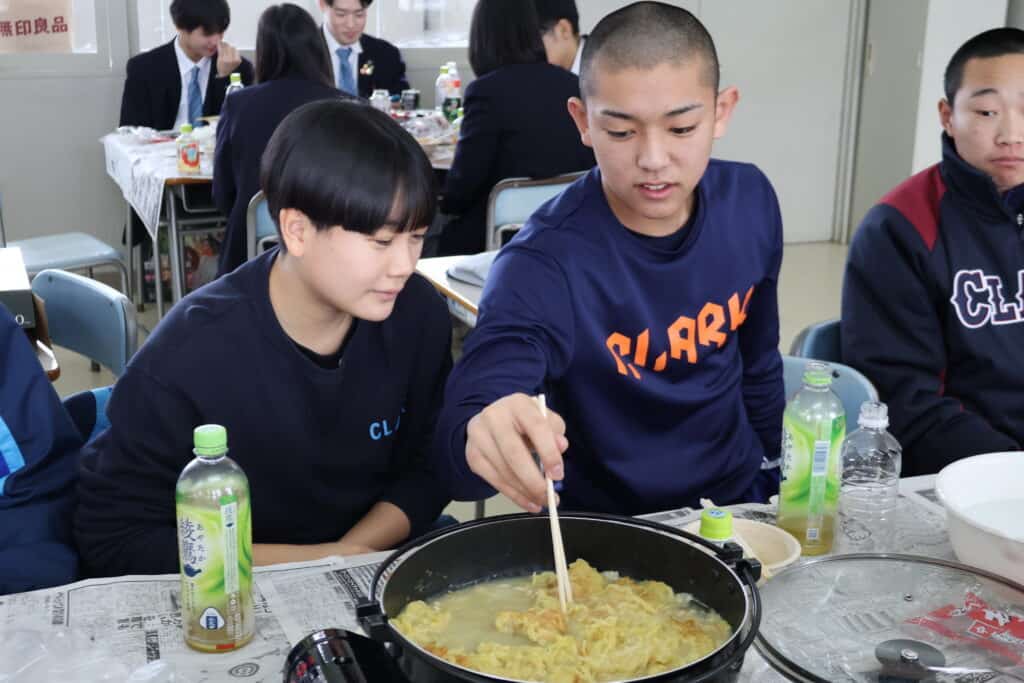 調理を通して自然と会話が生まれ、普段の授業とはまた違った表情が見られたのも印象的でした。友人同士で協力する姿や、鍋を囲んで交流する様子から、3年間で育んできた仲間との絆の深さが感じられる時間となりました。