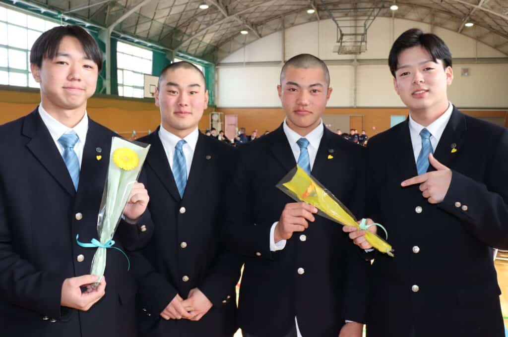 その後、後輩たちから3年生一人ひとりへ花が手渡されました。花を受け取る3年生の姿には、これまでの日々の積み重ねや後輩たちとのつながりが重なり、思わず涙をぬぐう場面も見られました。言葉にしきれない「ありがとう」の気持ちが、花とともにまっすぐ届けられる、心に深く残る時間となりました。
